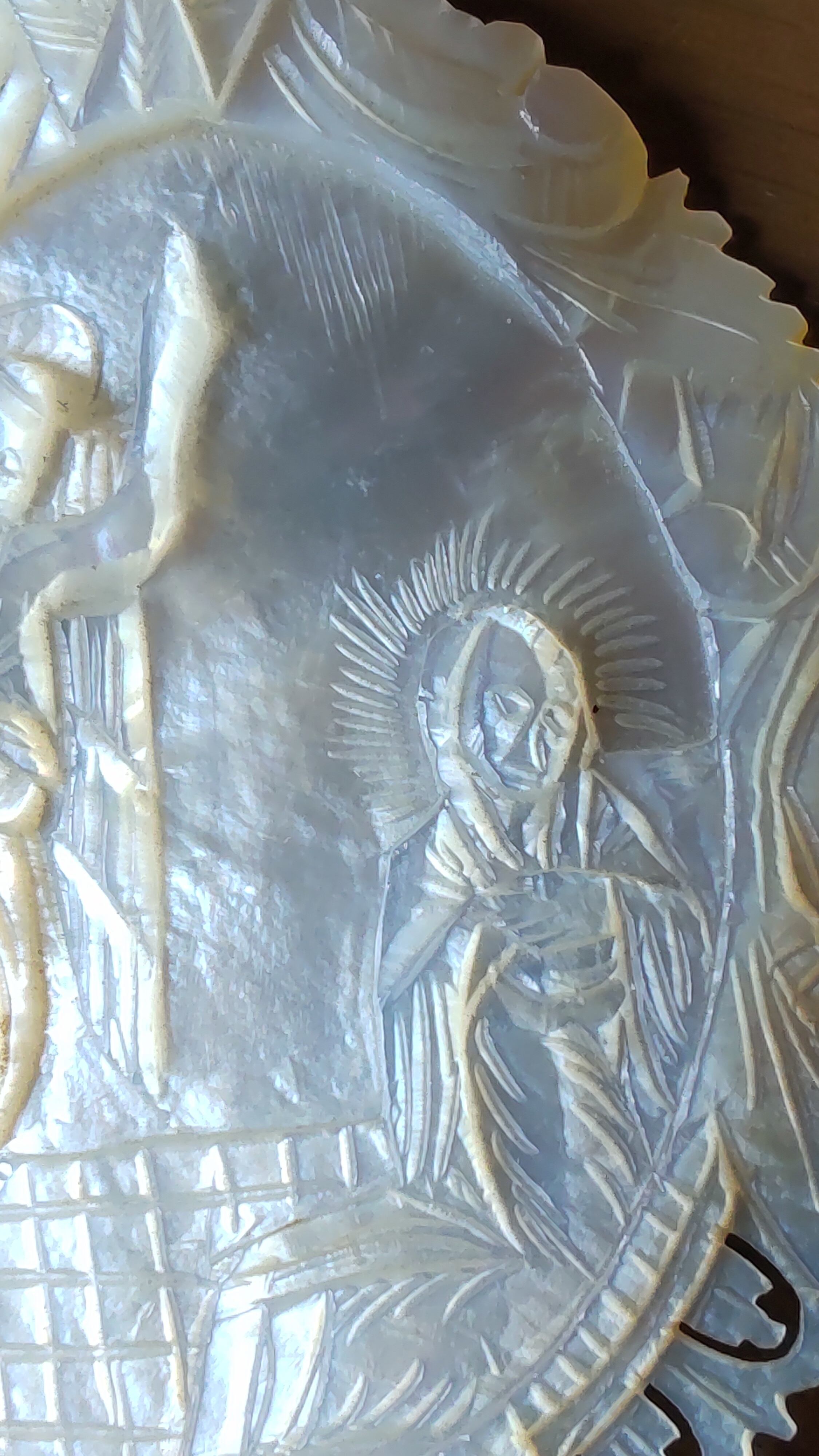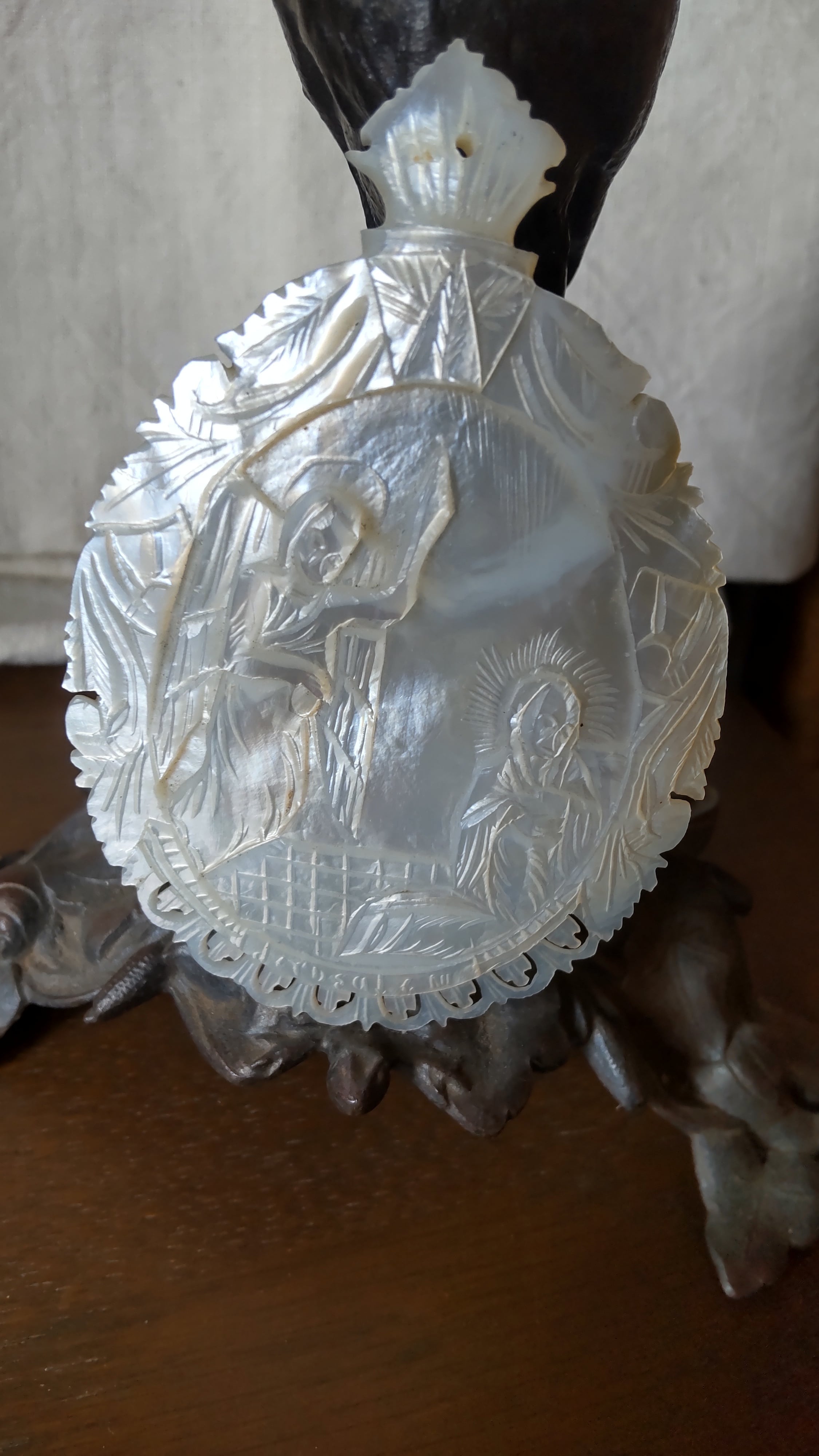 白蝶貝を彫刻したベツレヘムパールの大きなペンダントです。