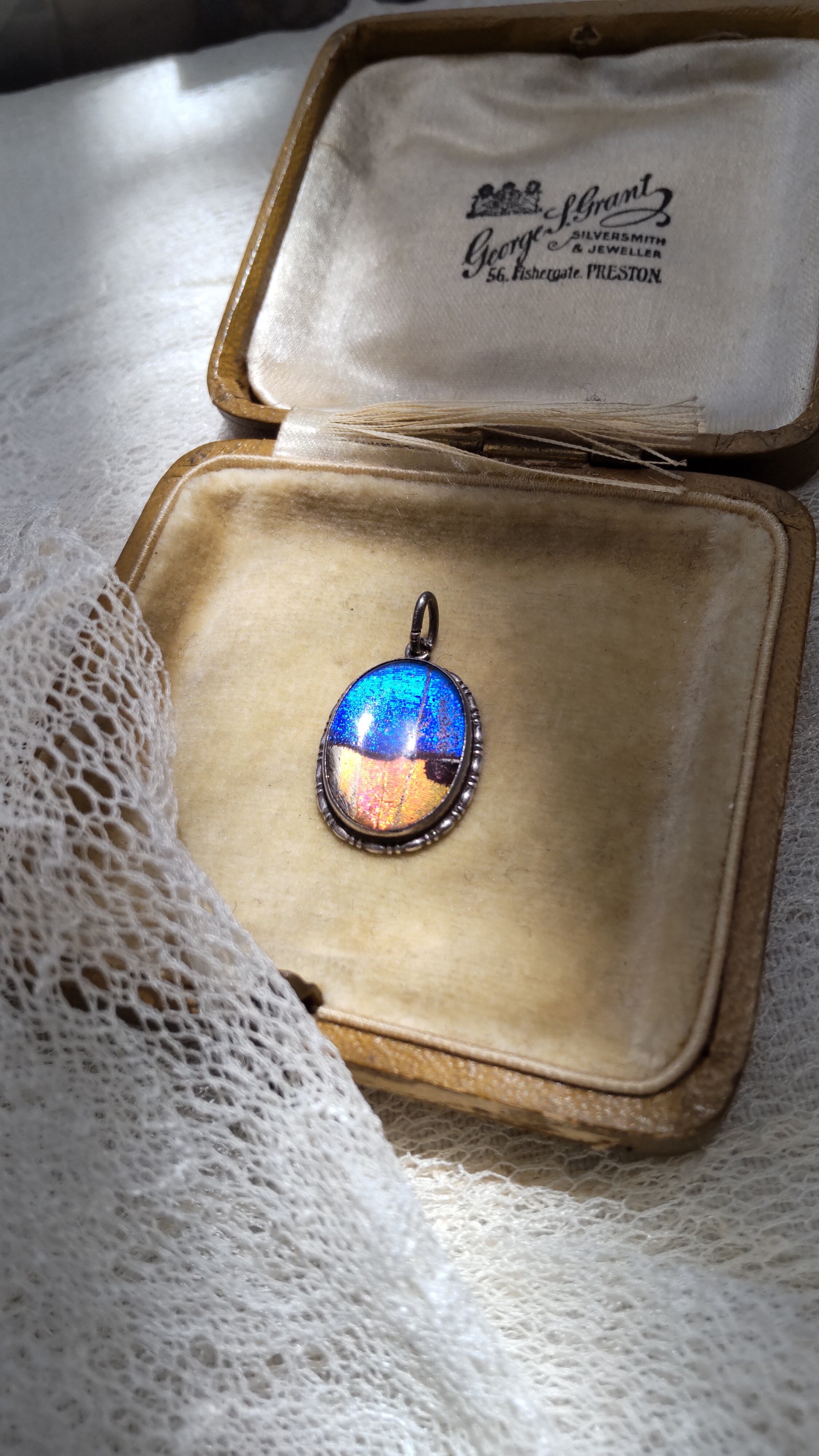 こちらは天然のモルフォ蝶の羽根を硝子の下に閉じ込めたヴィクトリア王朝時代末期から1940年代頃までに流行していたアクセサリーで、ブルー色やグリーンが一般的なのですがこちらは珍しいゴールド色と赤と黒、青色の小ぶりな使いやすいペンダントトップです。