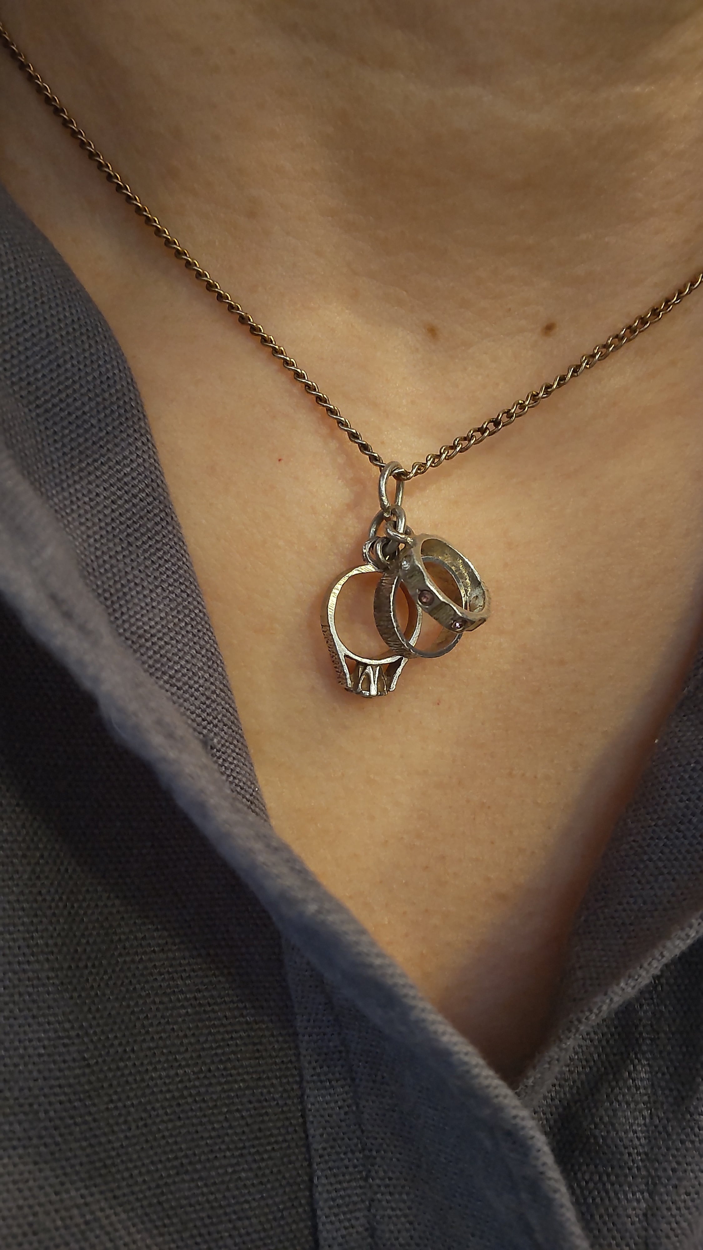 銀のチャームのモチーフはエンゲージメントリング、ウェディングリング、エタニティリングの3セット。