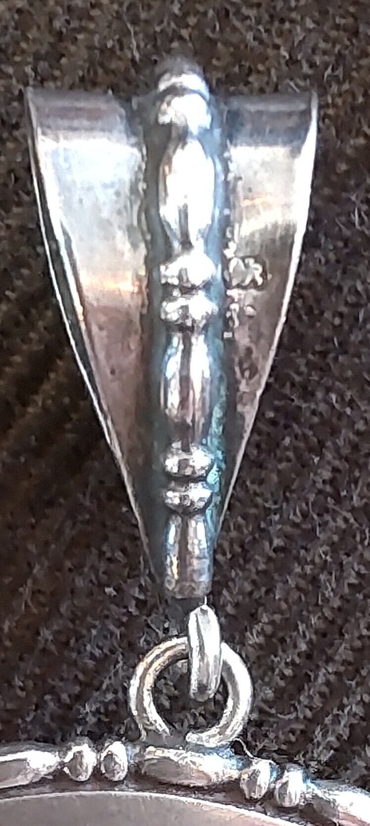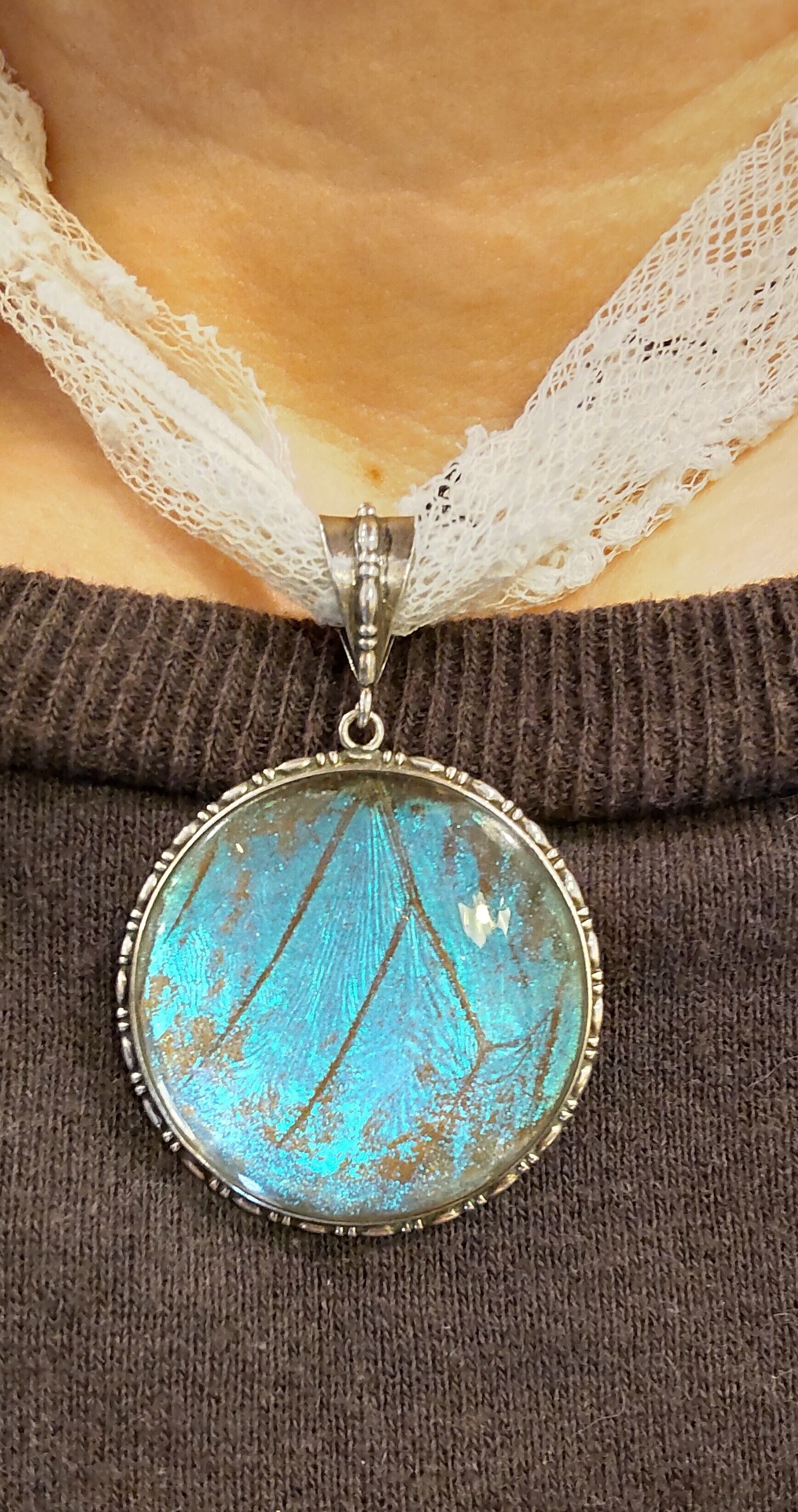 スターリングシルバー1920年バーミンガムの刻印がはっきりと、バチカンの部分にも英国で銀を示す横向きのライオンの刻印が入っているのが珍しいモルフォ蝶ペンダントです。