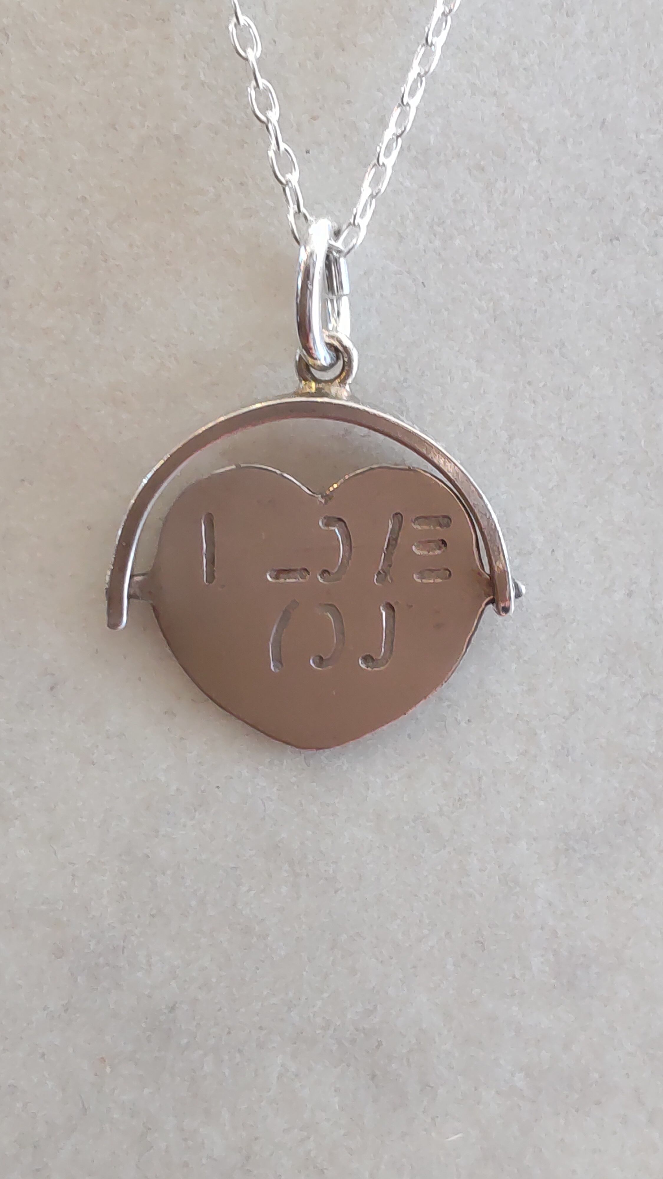 Hidden message spinning silver heart charm I love you.