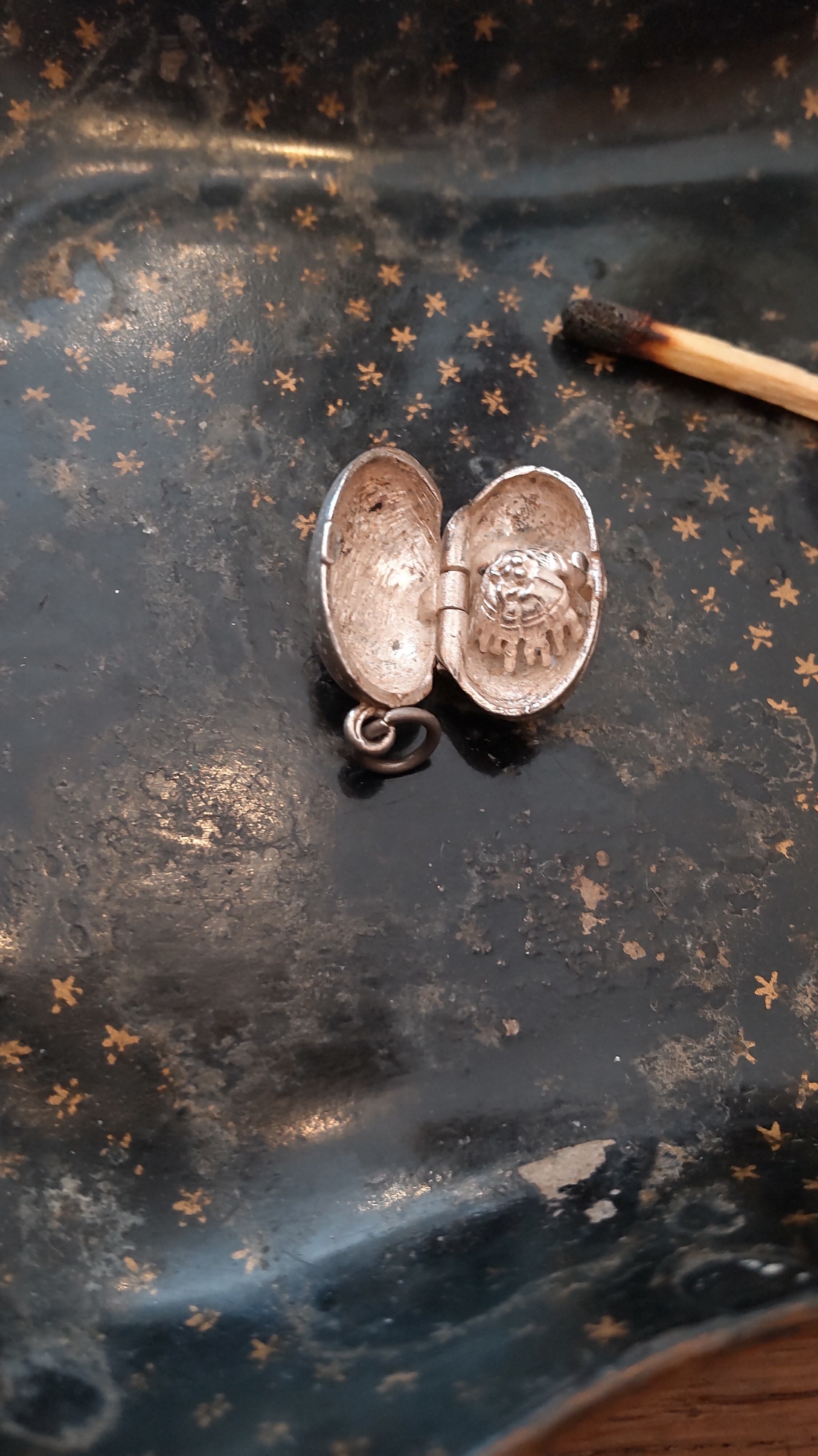1970年代頃のイギリスのヴィンテージシルバーチャーム、ラグビーボールの形をしていて中を開けるとスクラムを組んでいるラグビープレイヤー達が居ます。