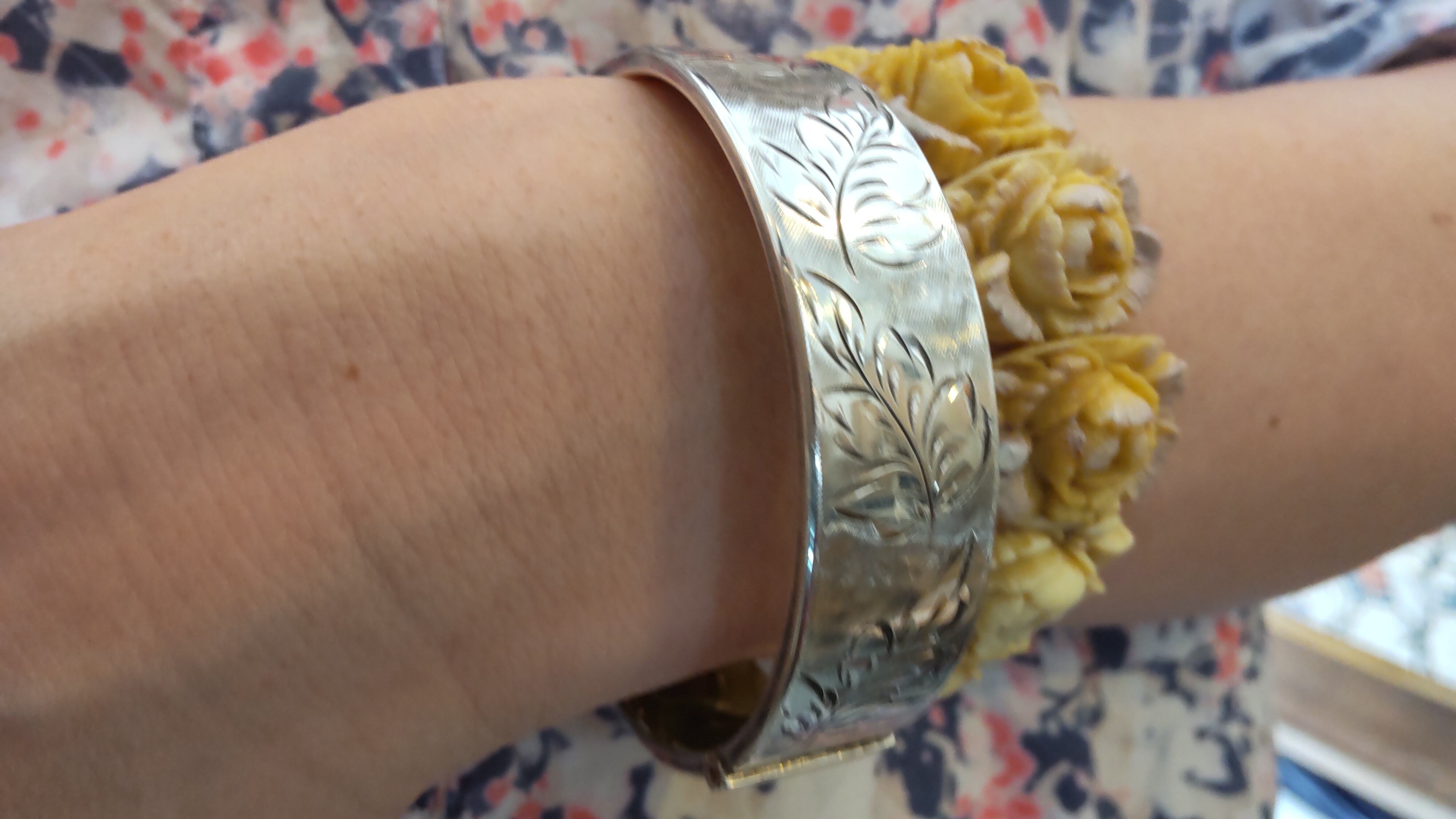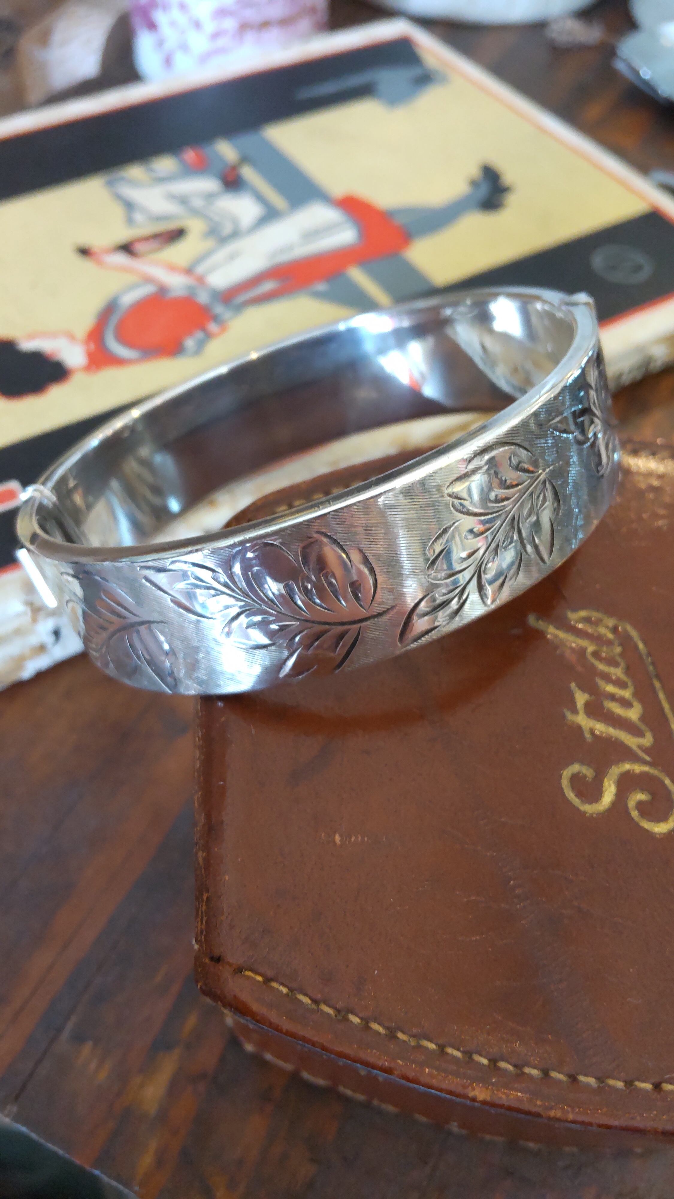 イギリス製1963年の刻印入ヴィンテージシルバーリーフ柄のバングル、ブレスレットです。