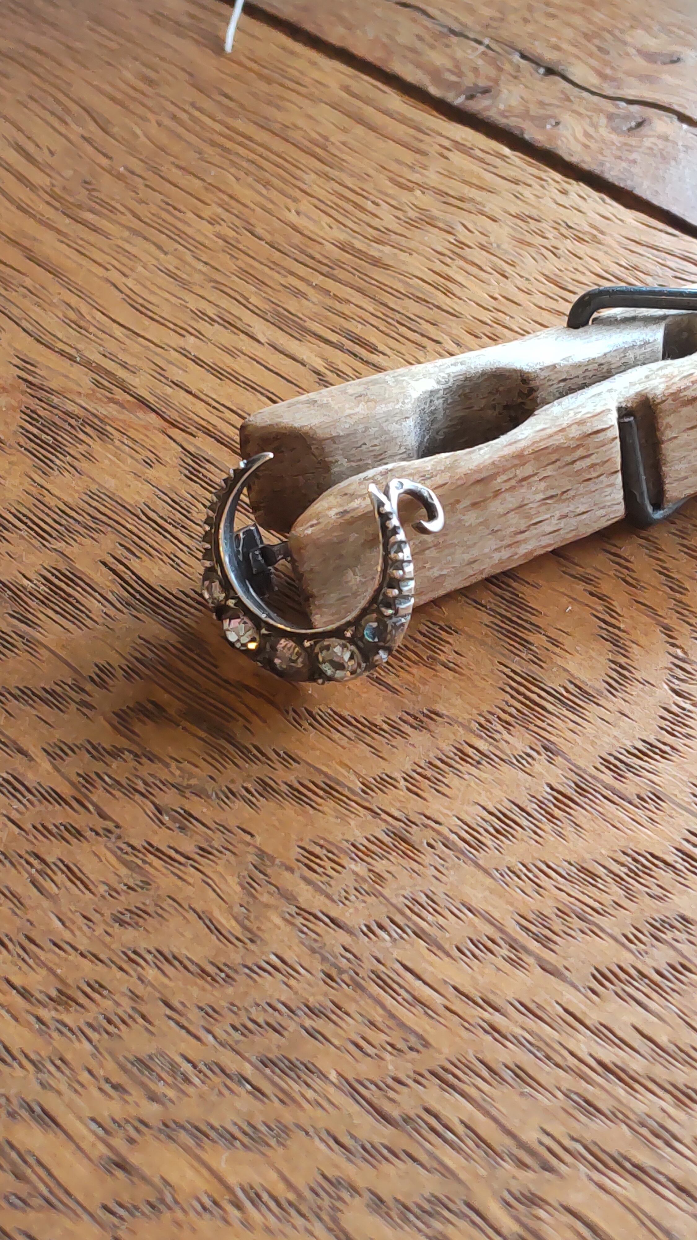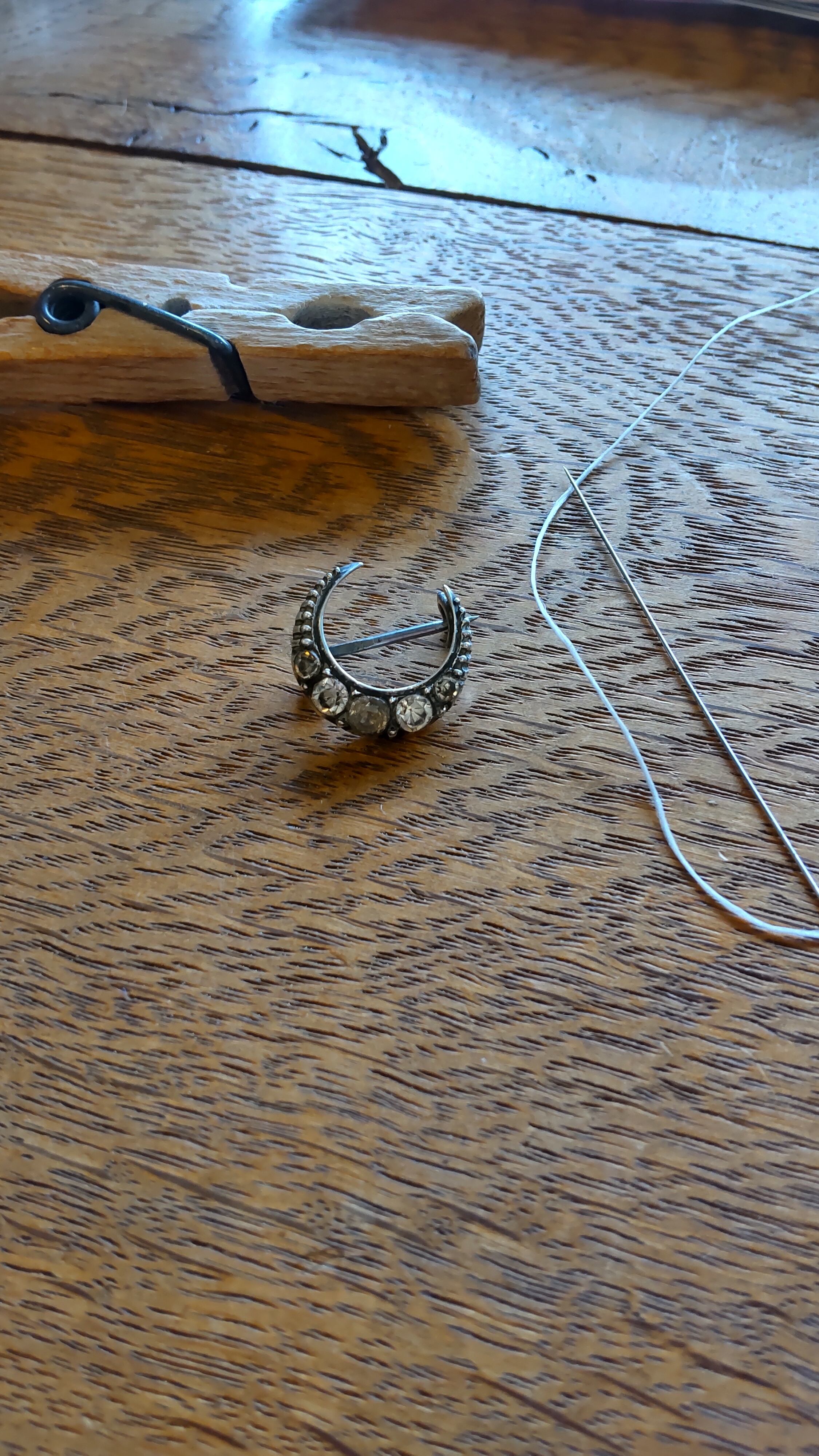 とても小さな三日月の形のブローチにガラスのラインストーンが埋め込まれています。