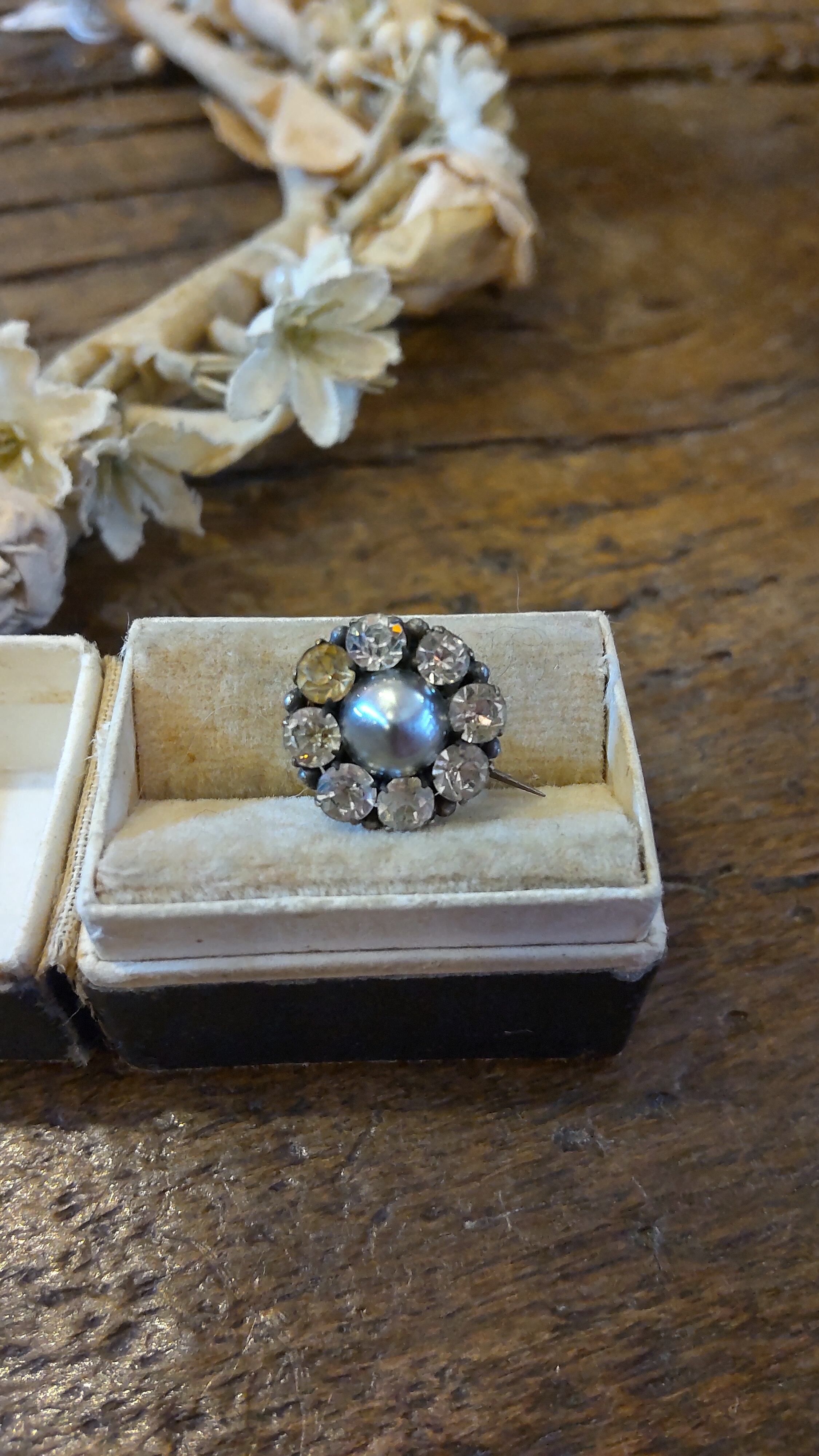 8個のガラスラインストーンの中央にブラック・パールを模造したグラスパールがアクセントの真鍮製のブローチです。