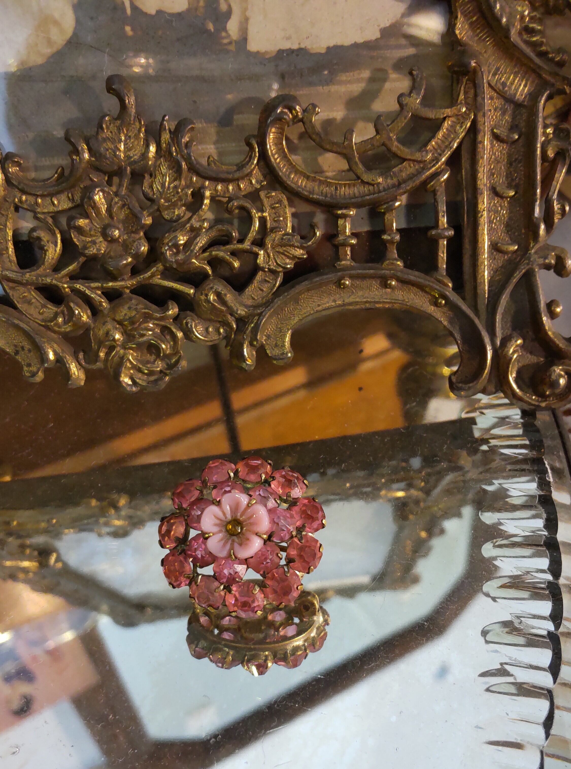 中央のお花の形のガラスも真鍮の爪で5箇所留めてあり、周りの透明なピンクのラインストーンも全て爪で留められています。