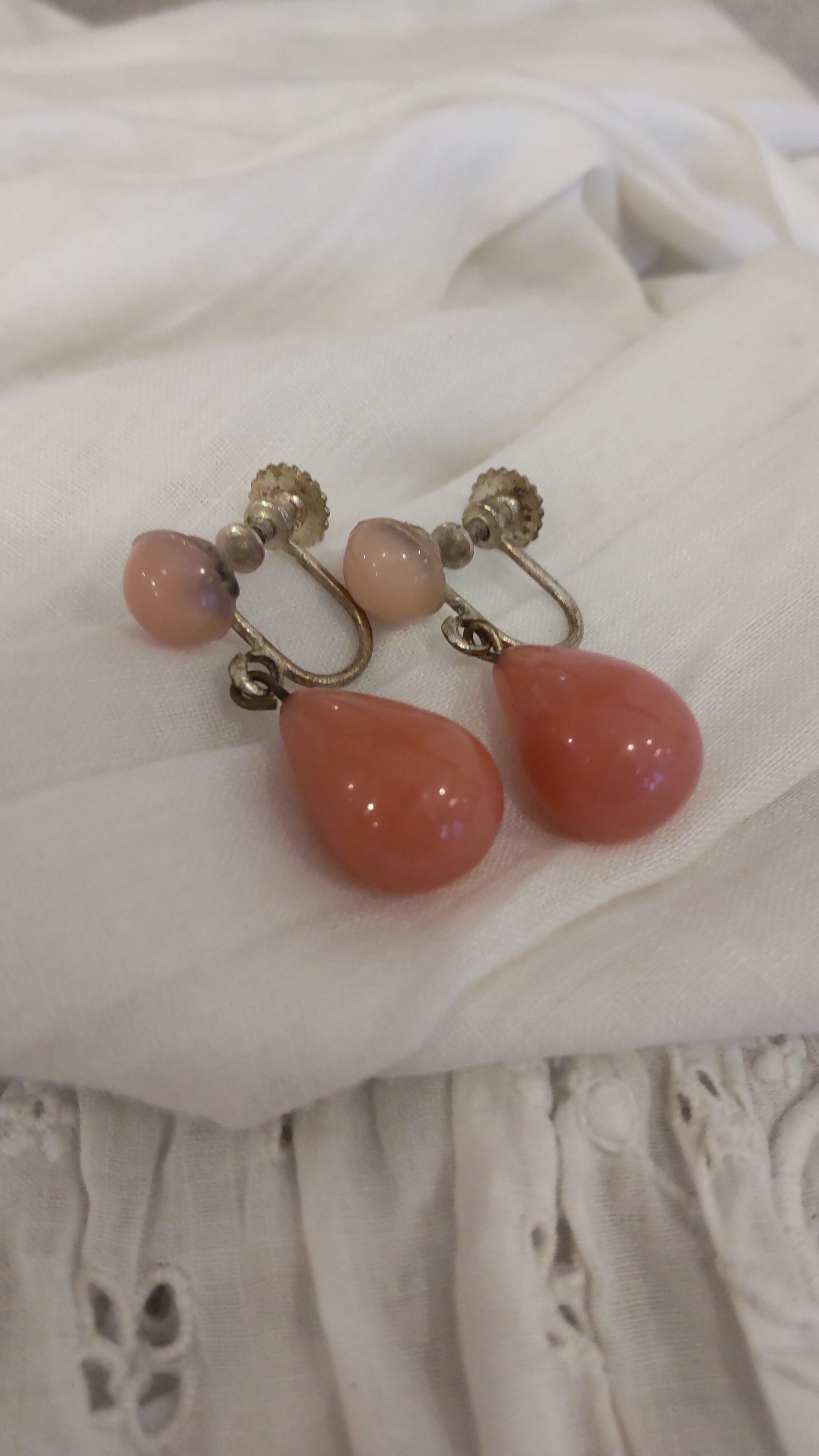 ヴィンテージ雫型のピンクの硝子ドロップイヤリング