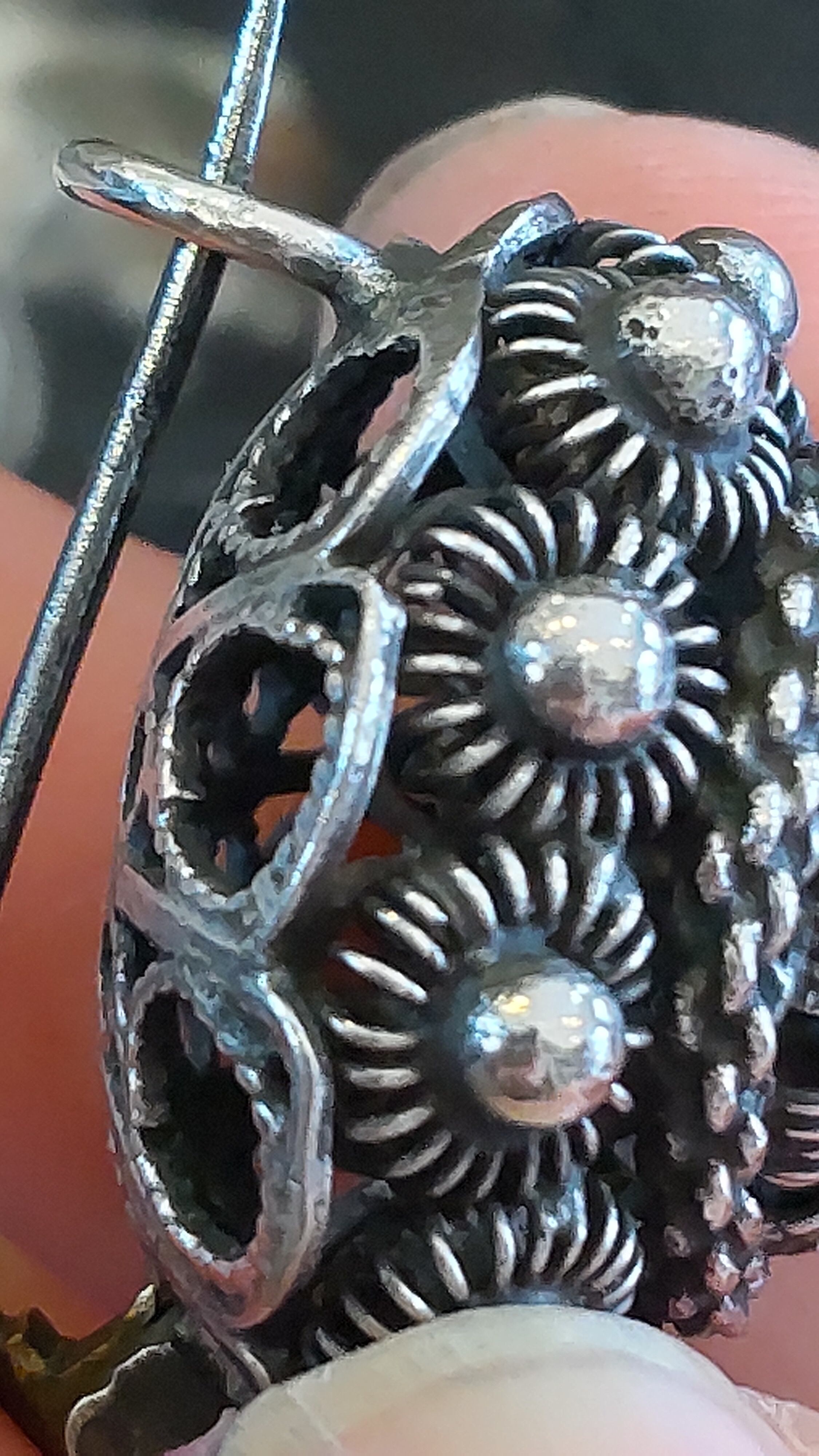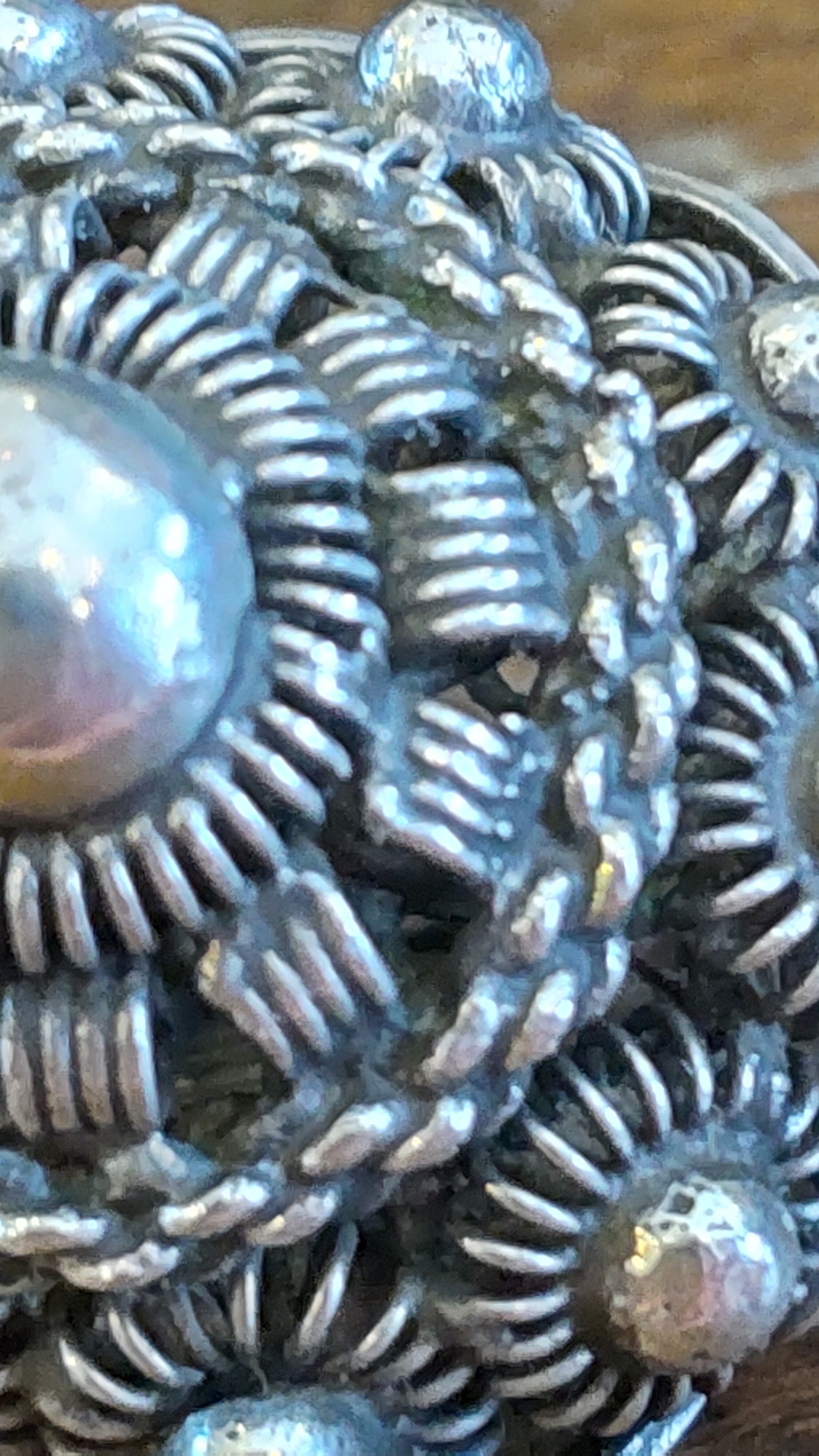 通常見かけるフィリグリーアンティークのボタンより大きなサイズで、直径約24mm、ブローチの裏にも銀線細工が施されているので横から見ても綺麗です。