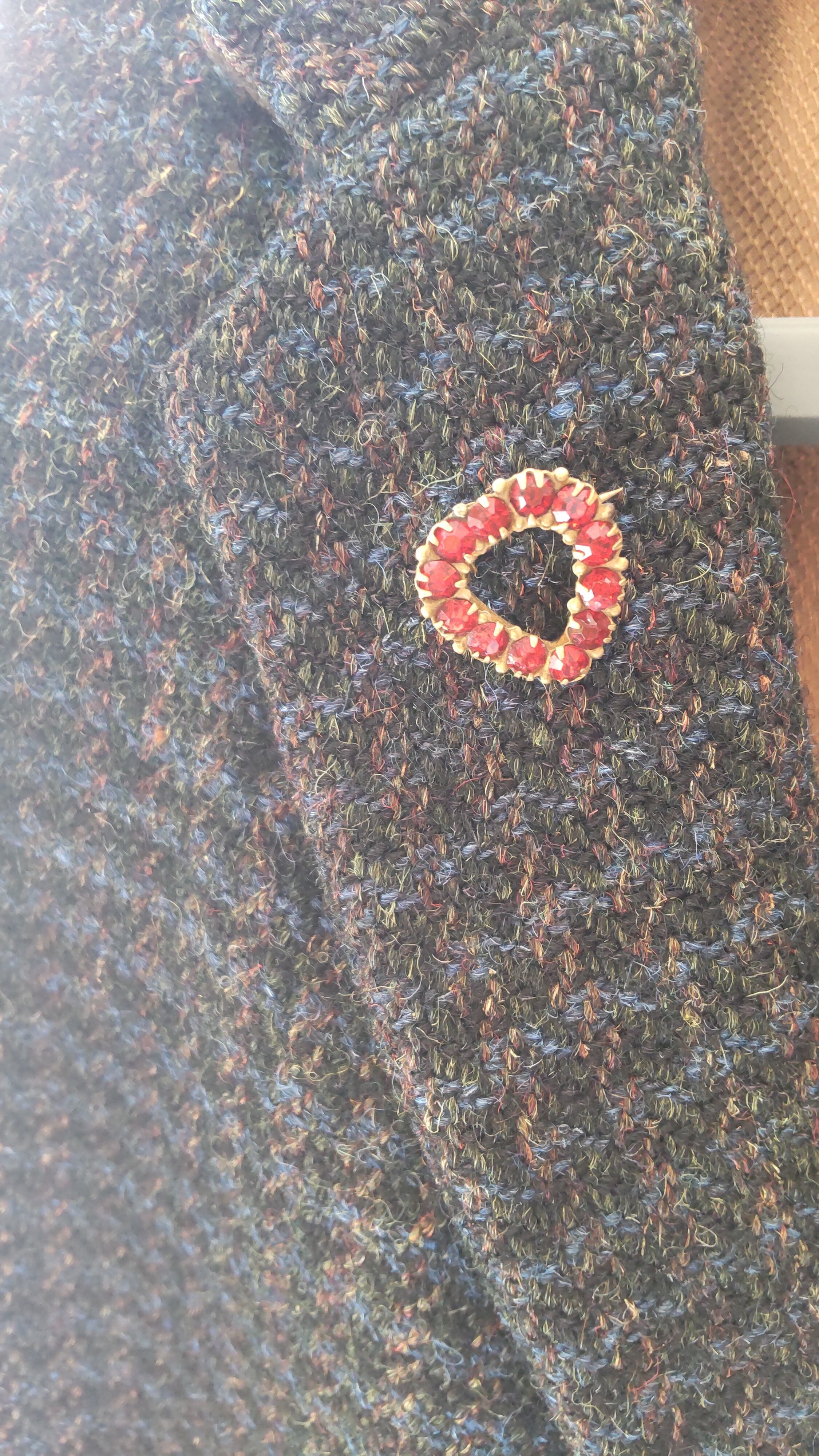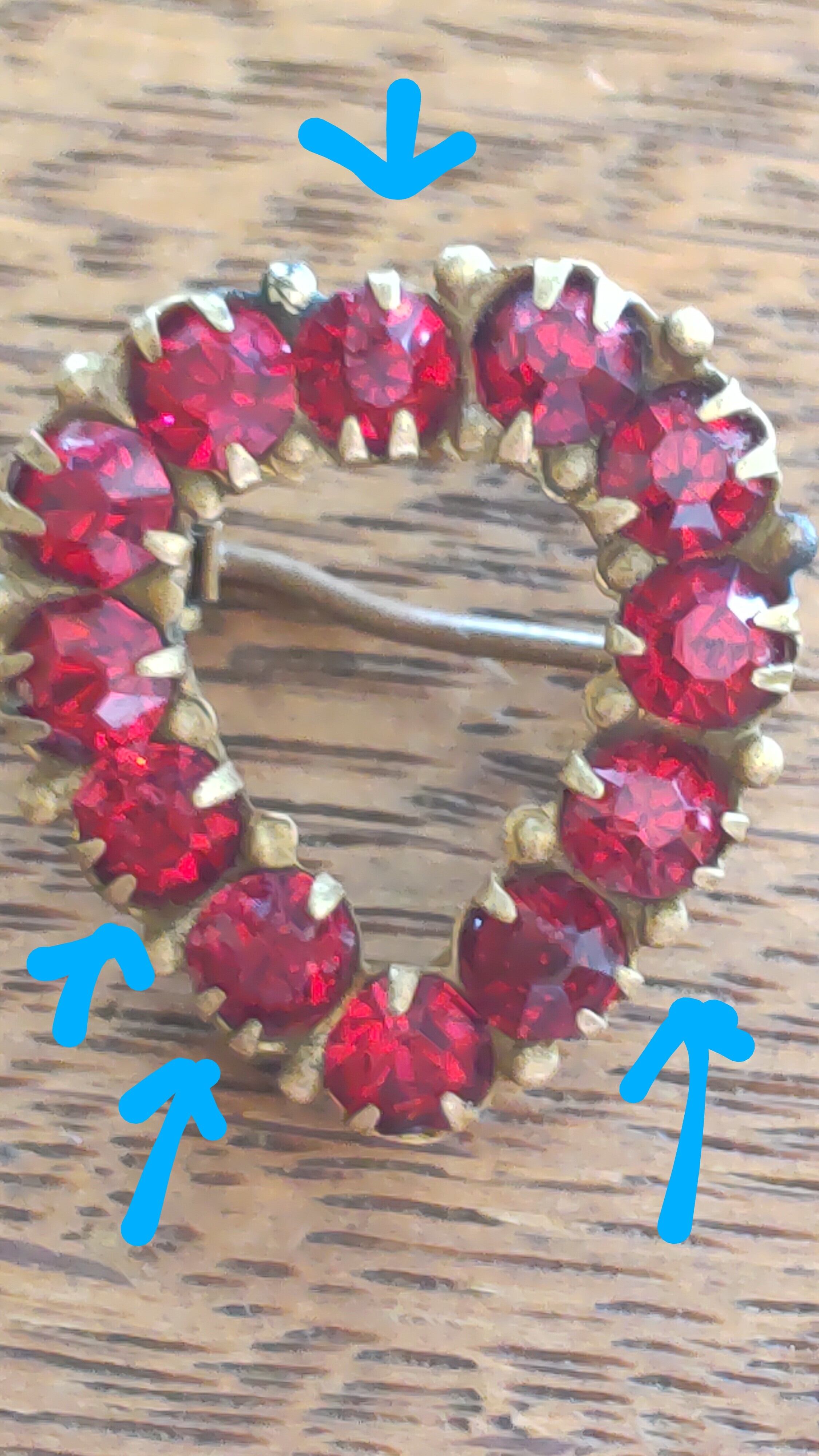 ヴィクトリアンの真っ赤な硝子のラインストーンが真鍮の枠に爪でセットされたオープンハートブローチです。
