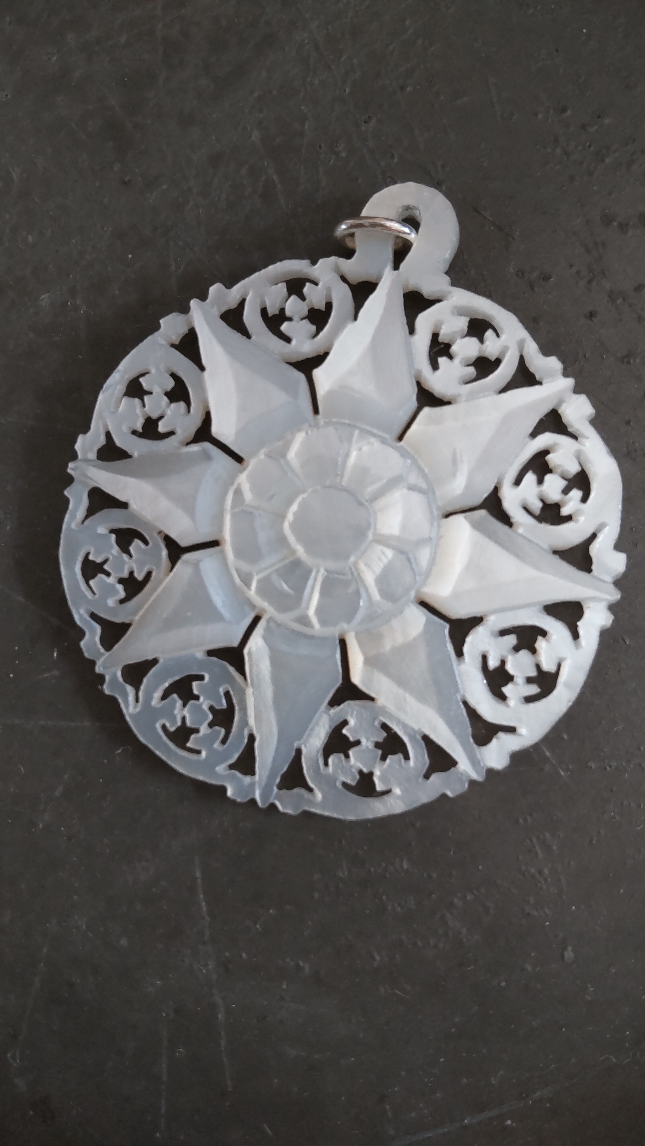 薄い貝に繊細な彫りと透かしがパレスチナの職人さんの手で作られたものです。