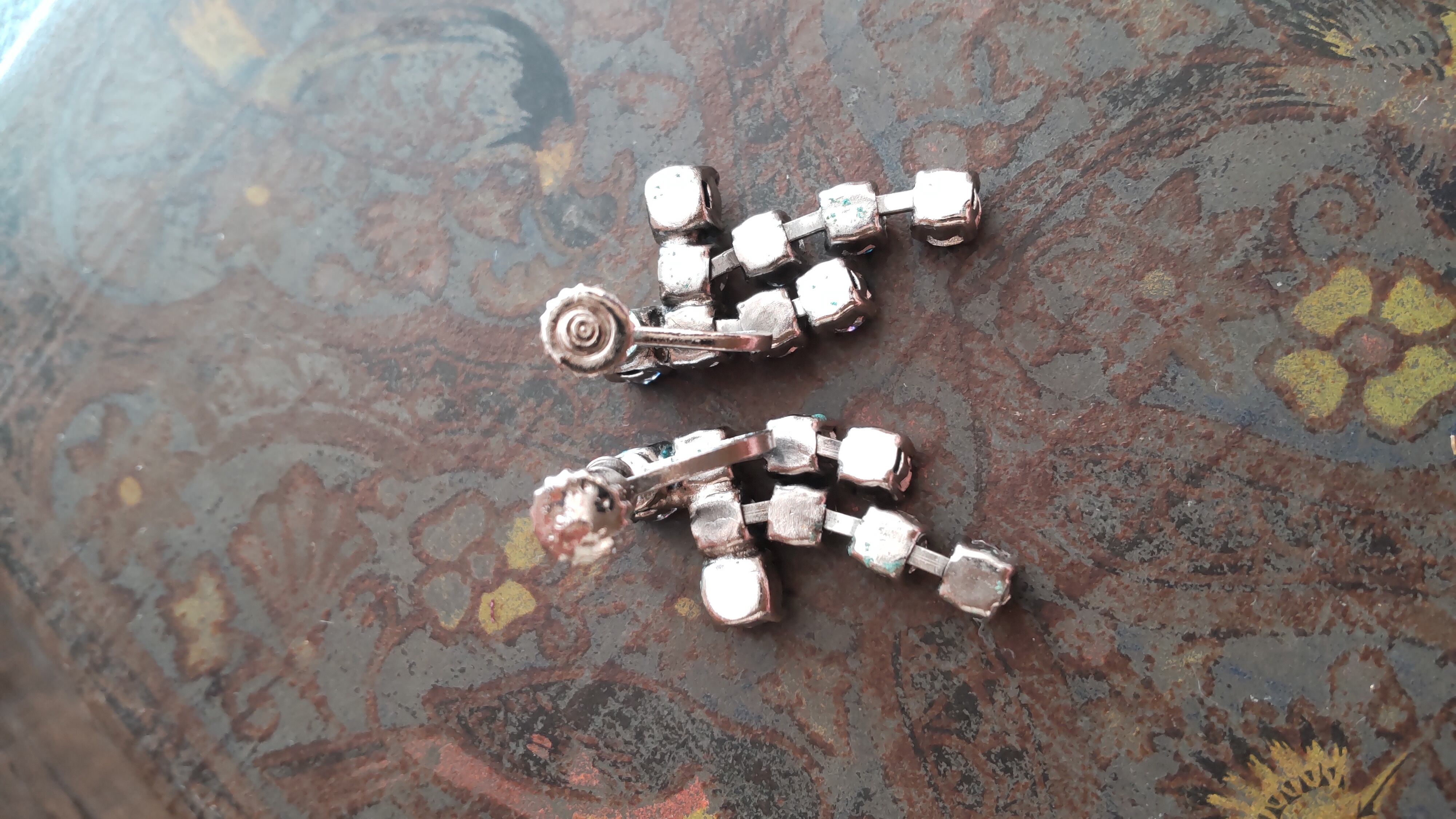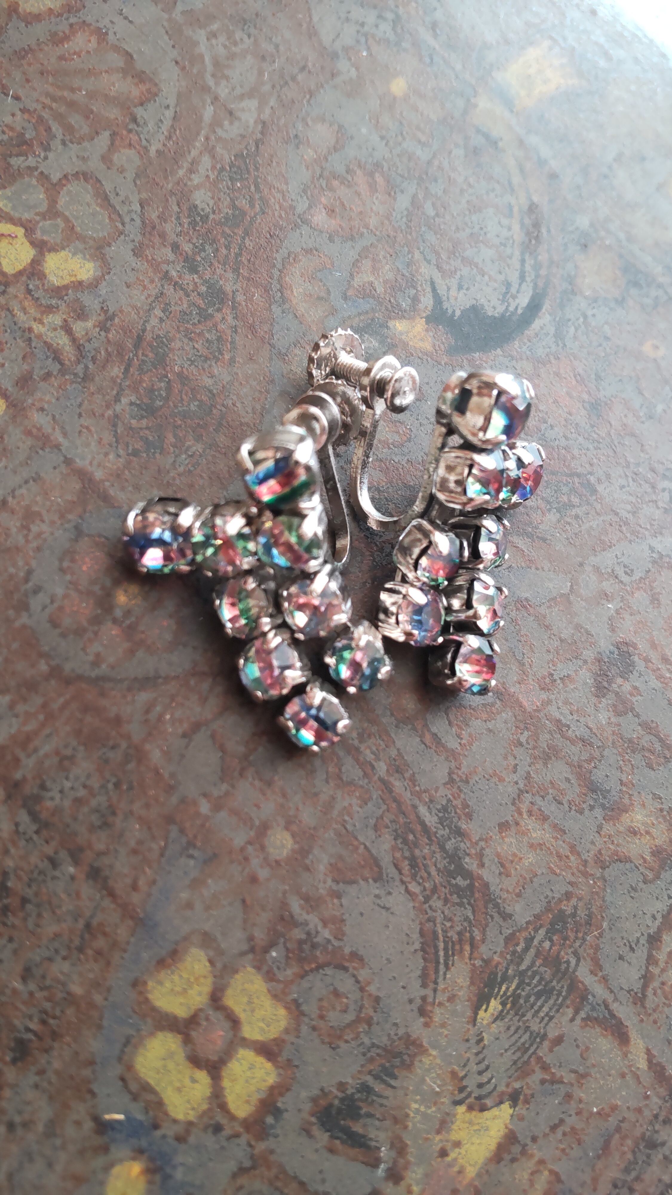 L字型に配列されたアイリスガラスのラインストーンから5つのラインストーンがぶら下がっているデザインで1970年頃のイヤリングだと思います。