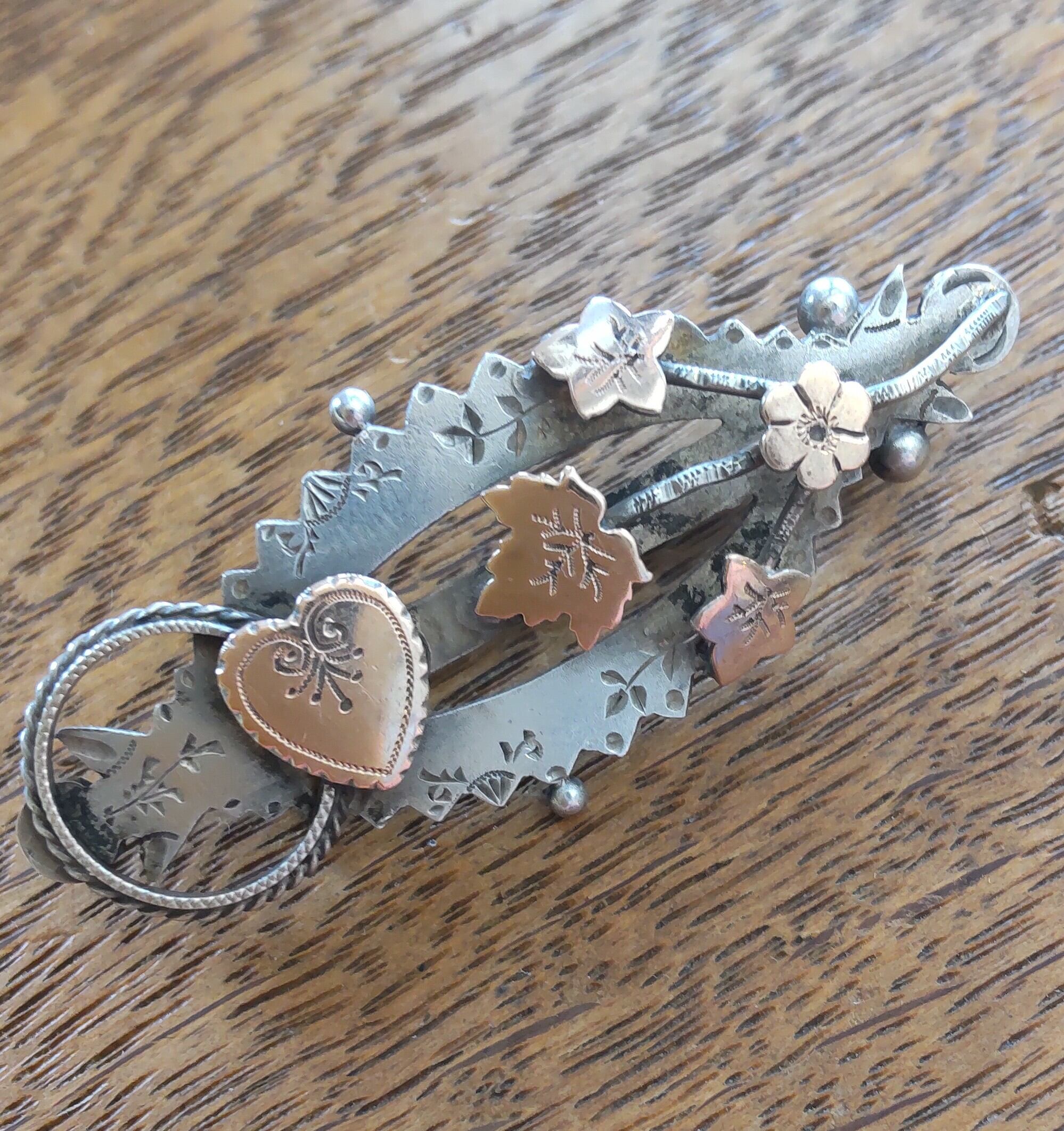 ヴィクトリアン末期、1900年バーミンガムのシルバーホールマークが入った銀とローズゴールドのブローチです。