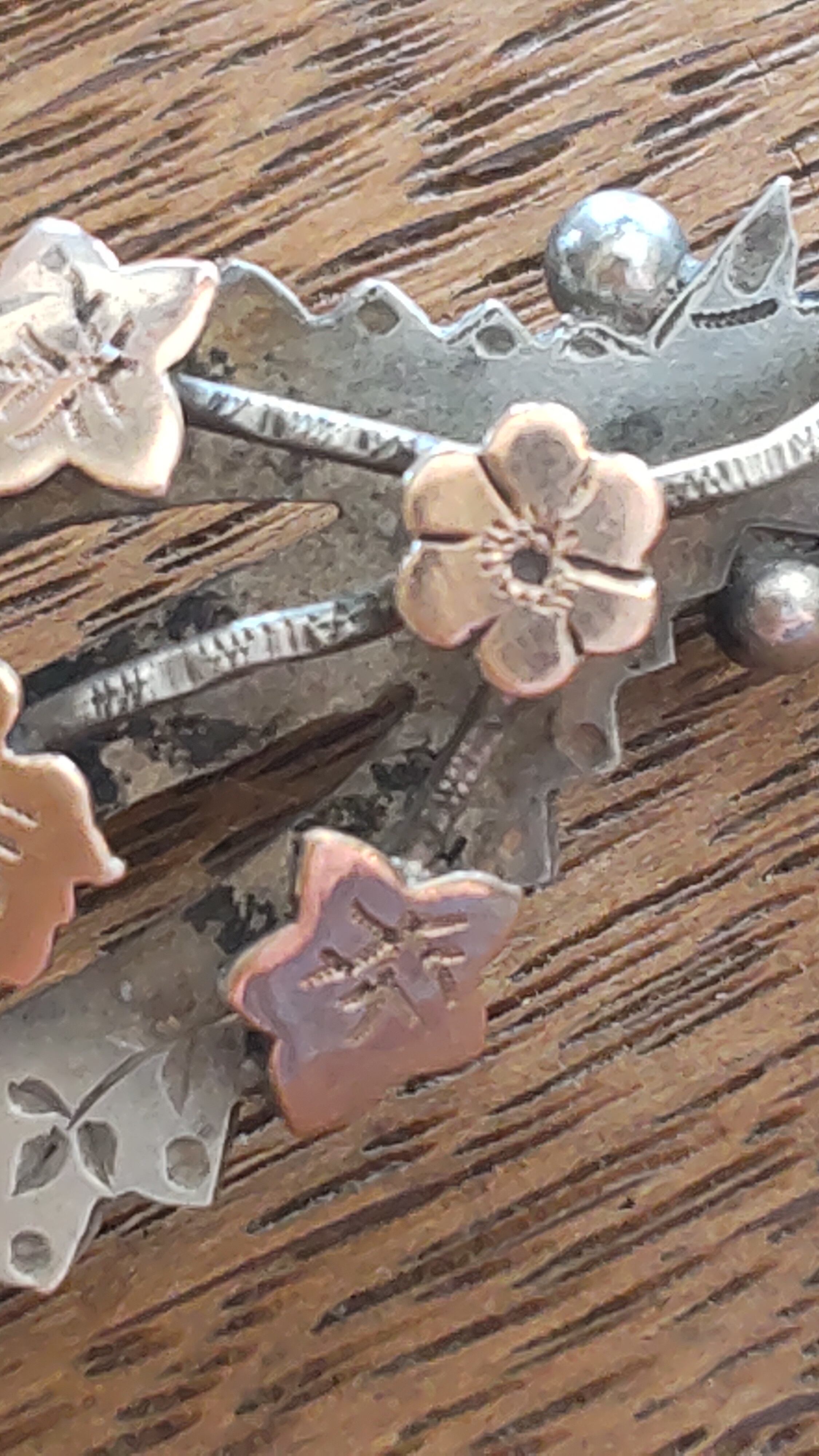 枝の部分にも細かく溝が彫ってあり銀の部分の小さなリーフなどの柄も可愛らしいブローチです。