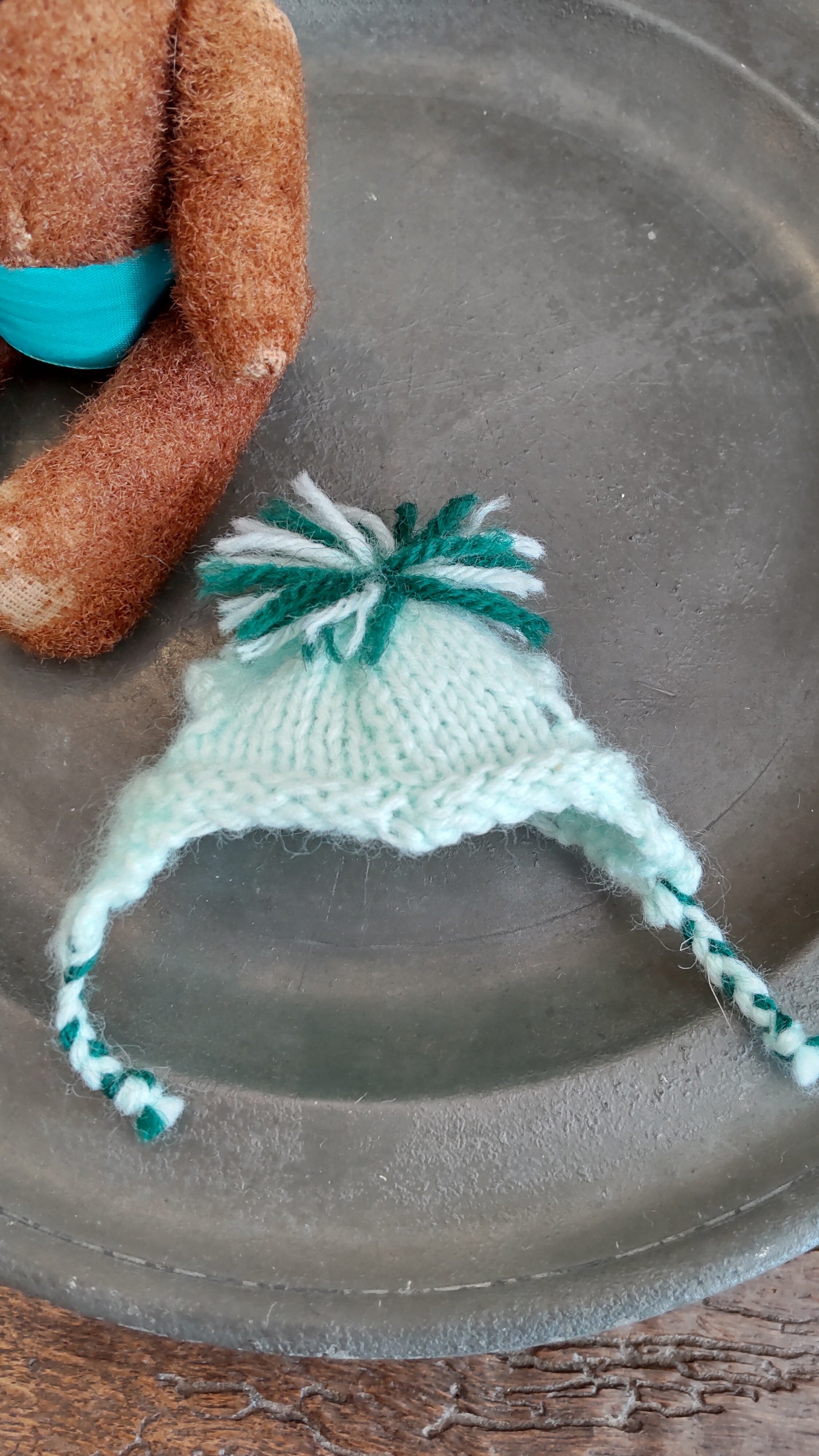 撮影で使った小物は付きません。テディベアと現代のハンドニット帽セットの販売です。