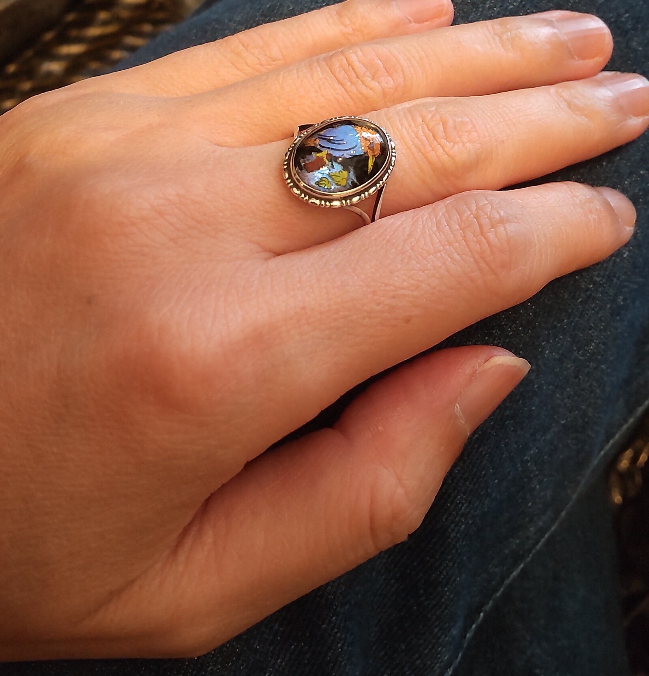 1920年代モルフォ蝶のカワセミの絵のシルバーリング 14号