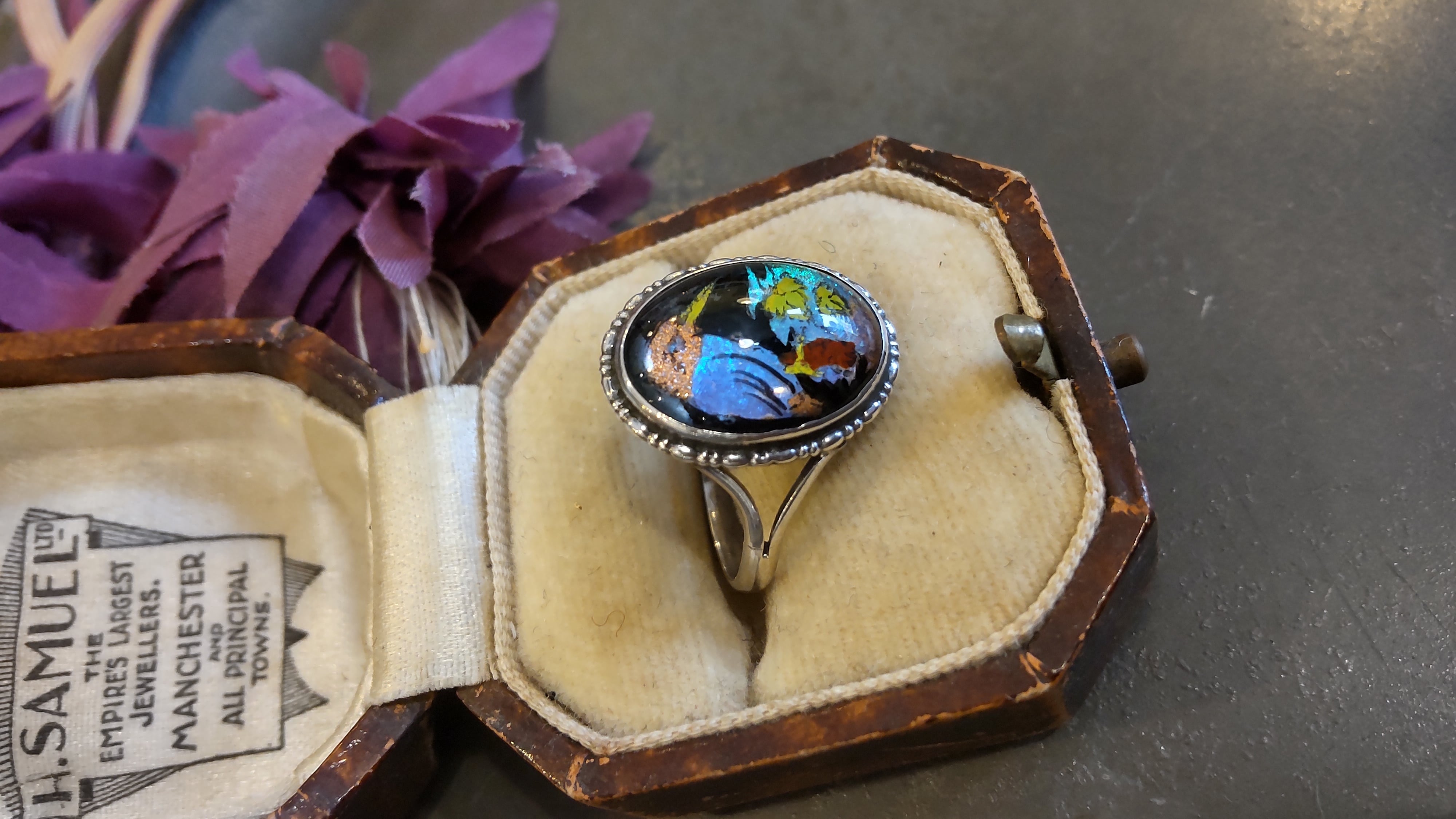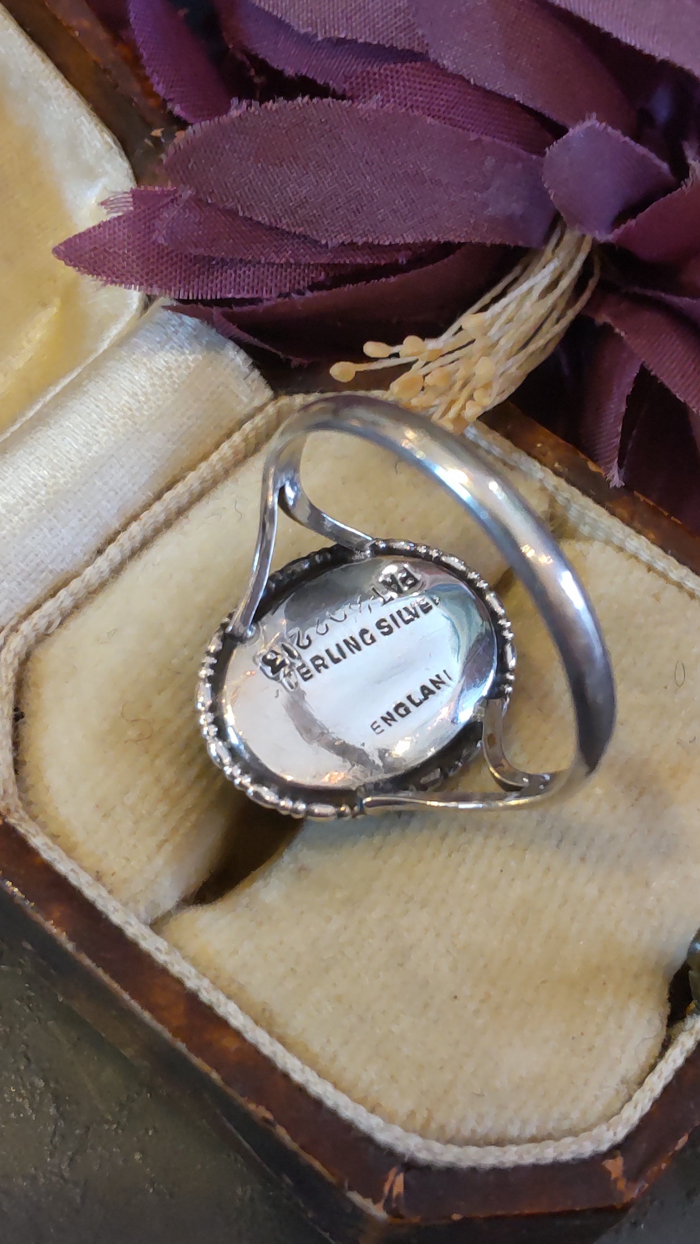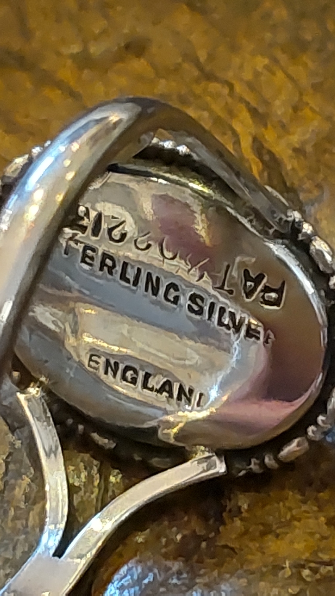 リングの裏側にはスターリングシルバー、英国製、特許番号202213の刻印が入っています。