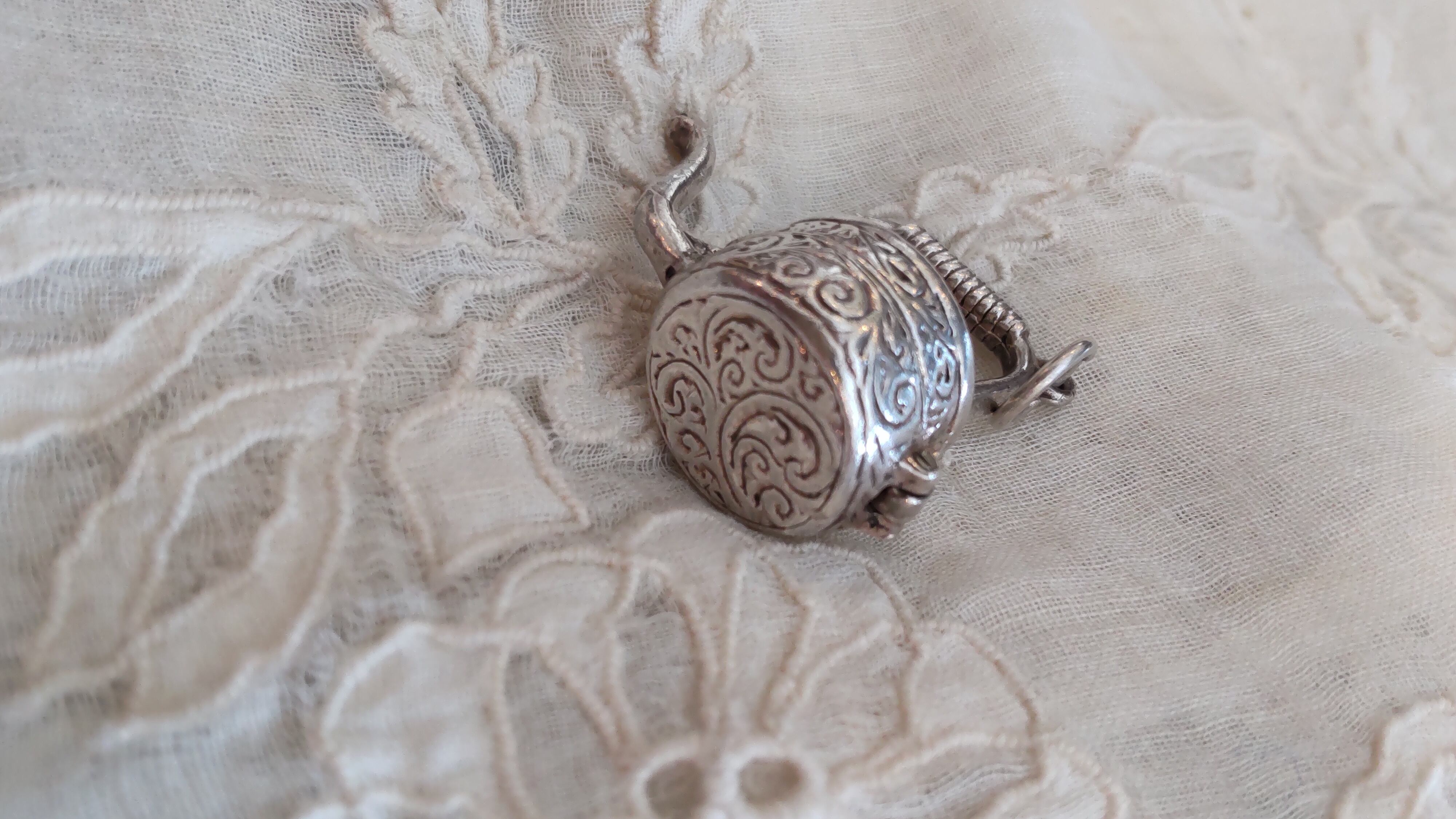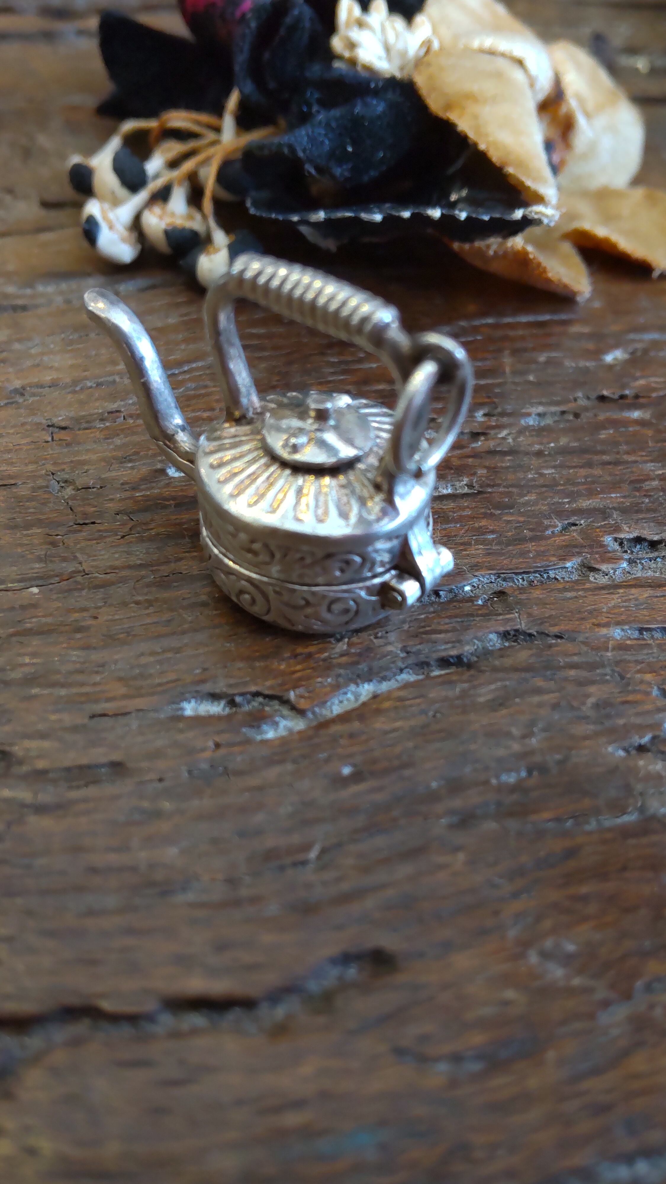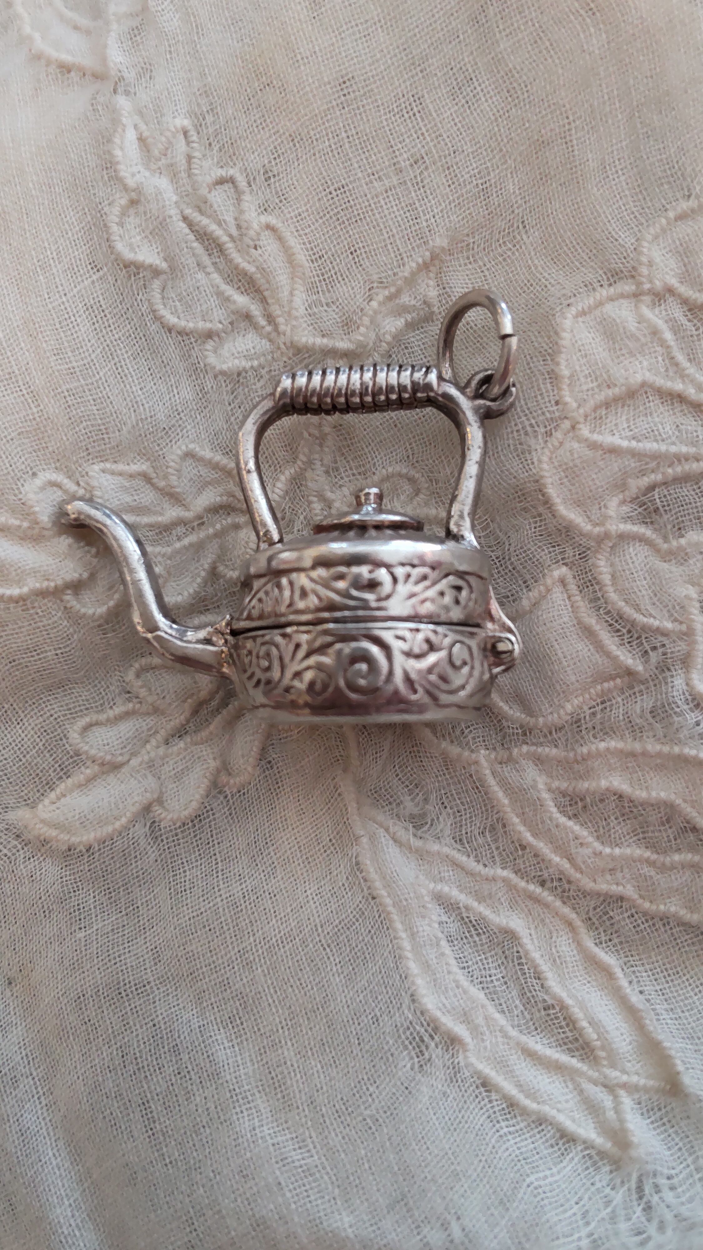 イギリスヴィンテージの開閉出来るシルバーチャームで、大きめのしっかりとしたケトル、やかんの形をしています。