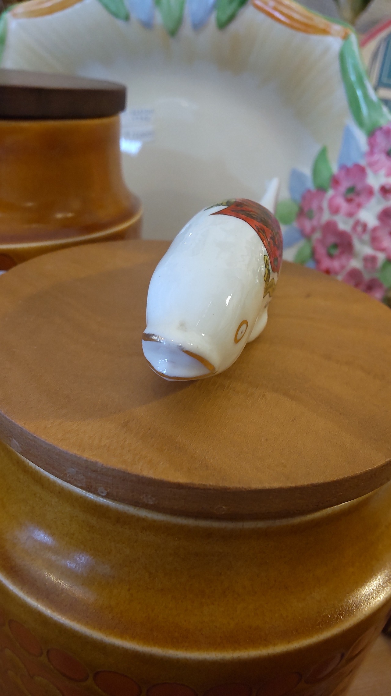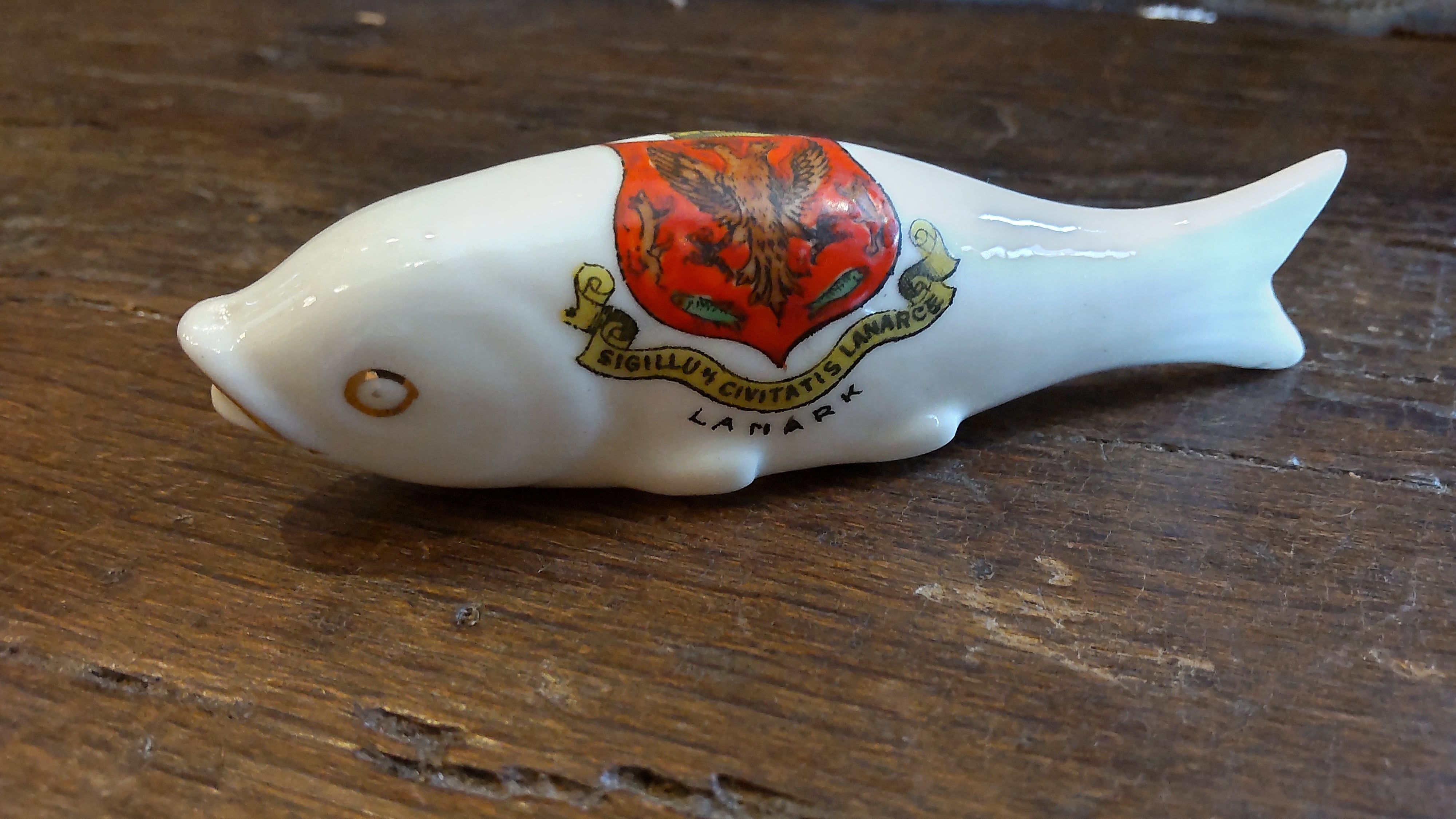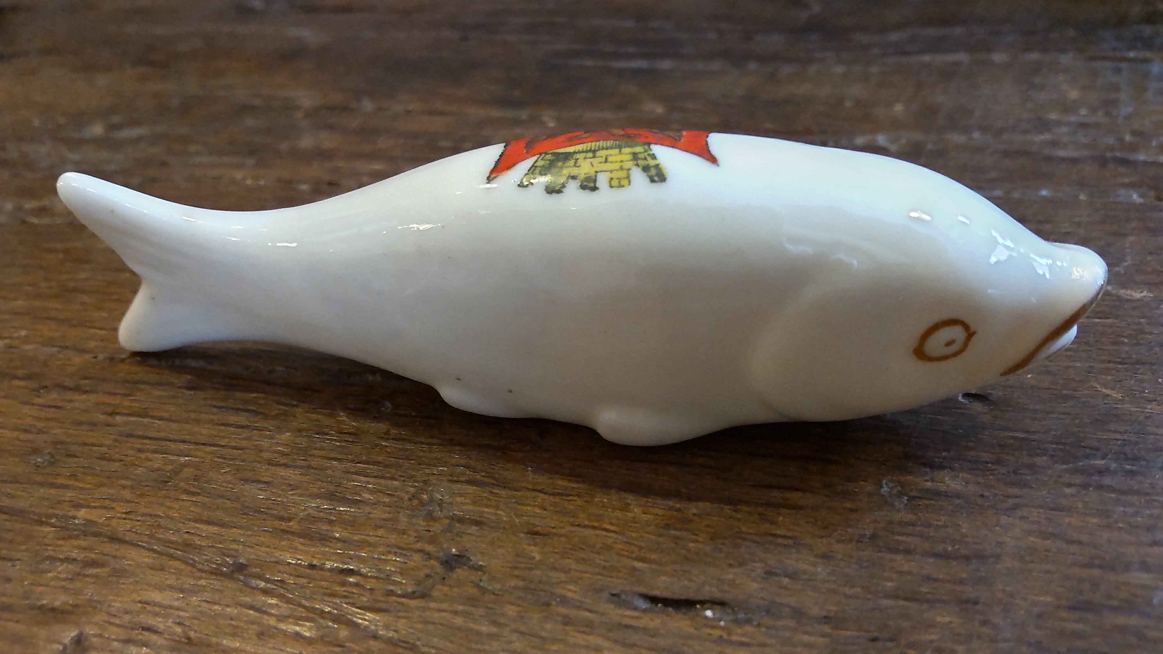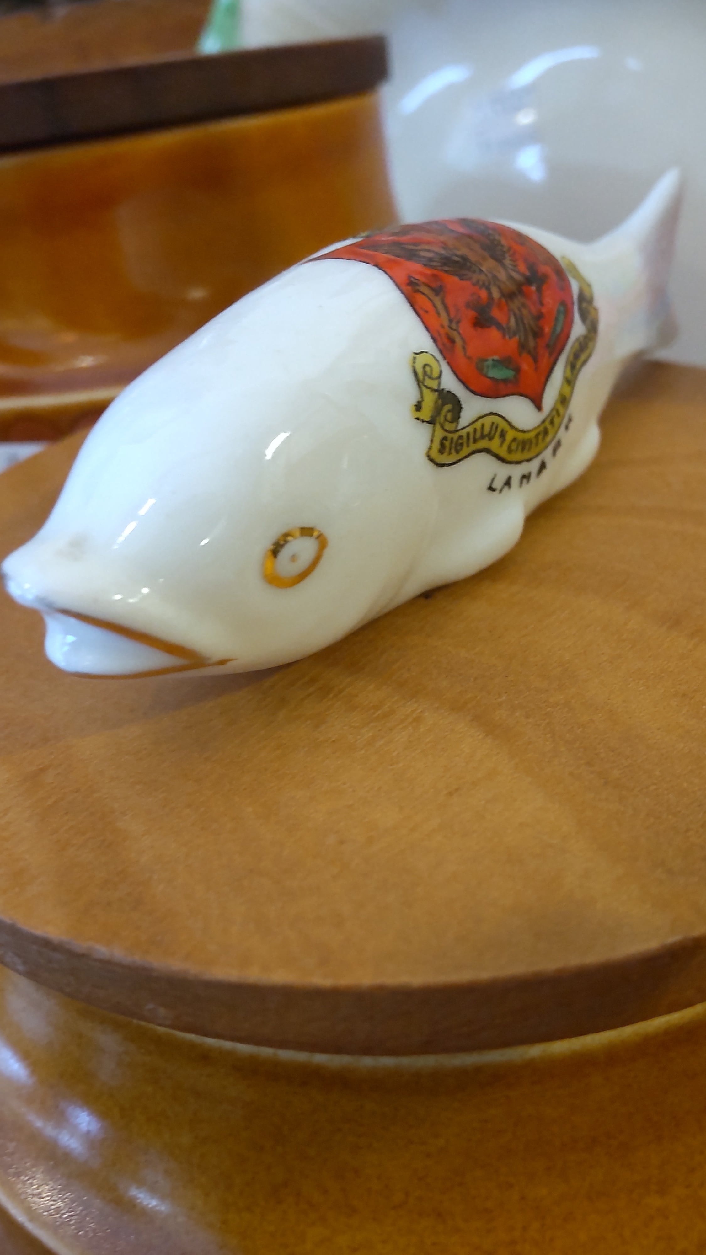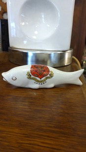 イギリスの1920年代頃の旅のお土産、スコットランドのLAMARKの紋章の入ったお魚の形の陶器の置物です。