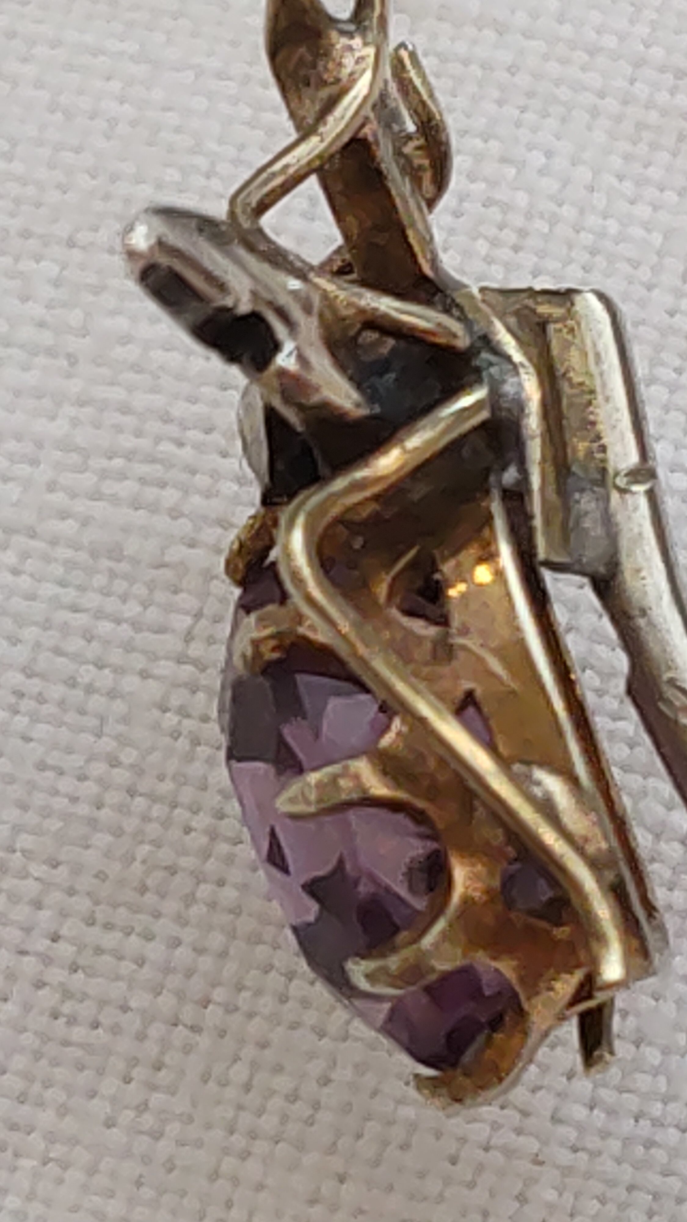 胴体の部分は天然石のアメジストで、羽を形どった部分にはシードパール(種の様に小さな真珠)が2つ、頭の部分には1つ、丁寧に留められています。