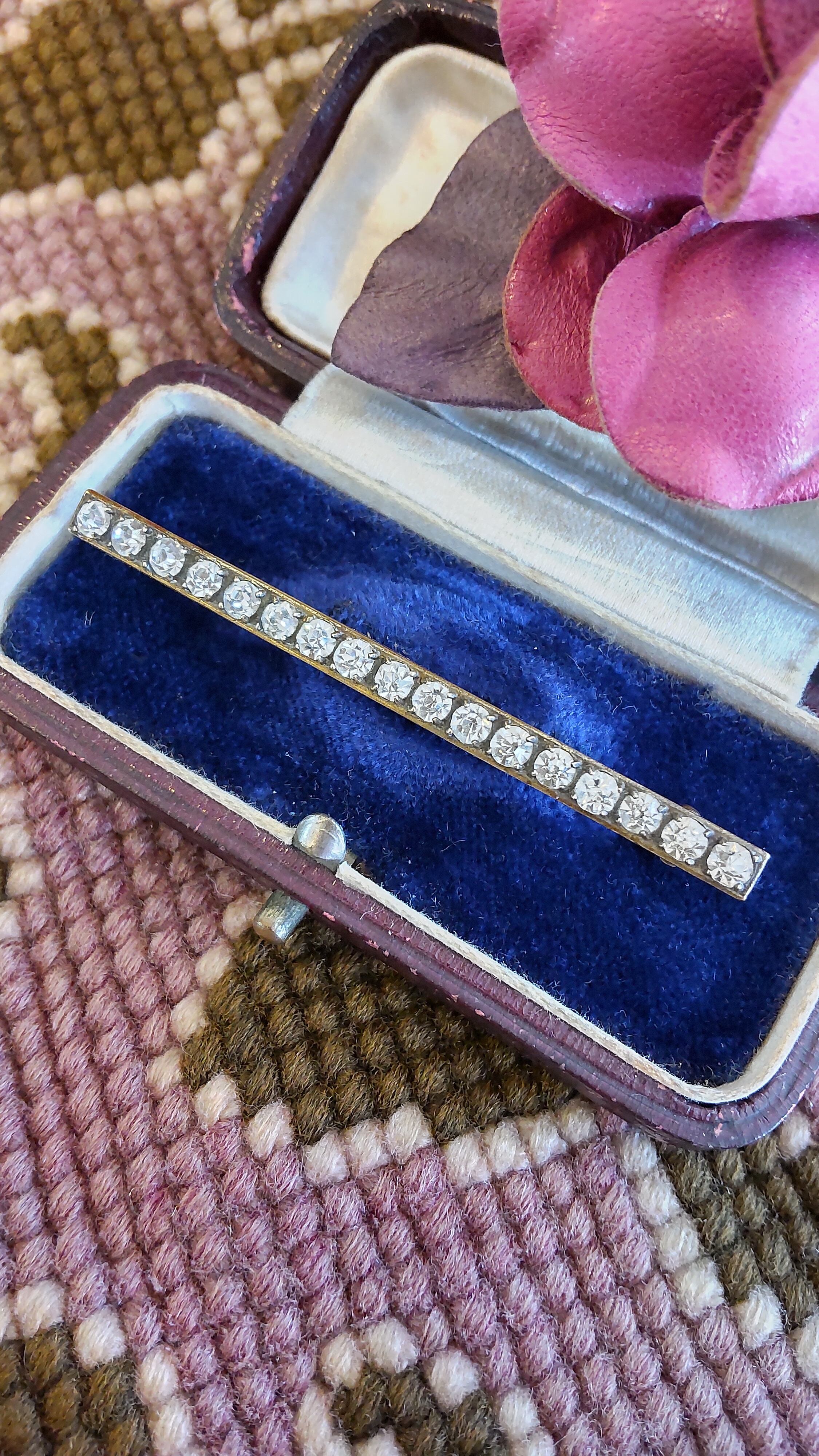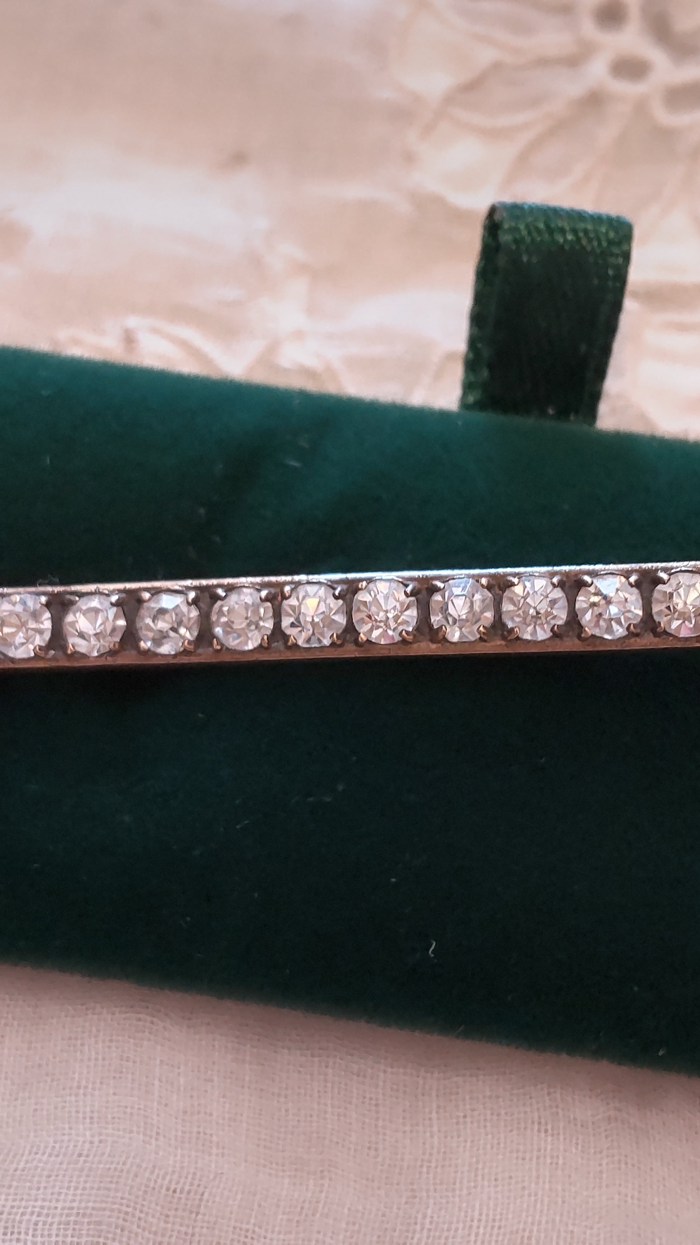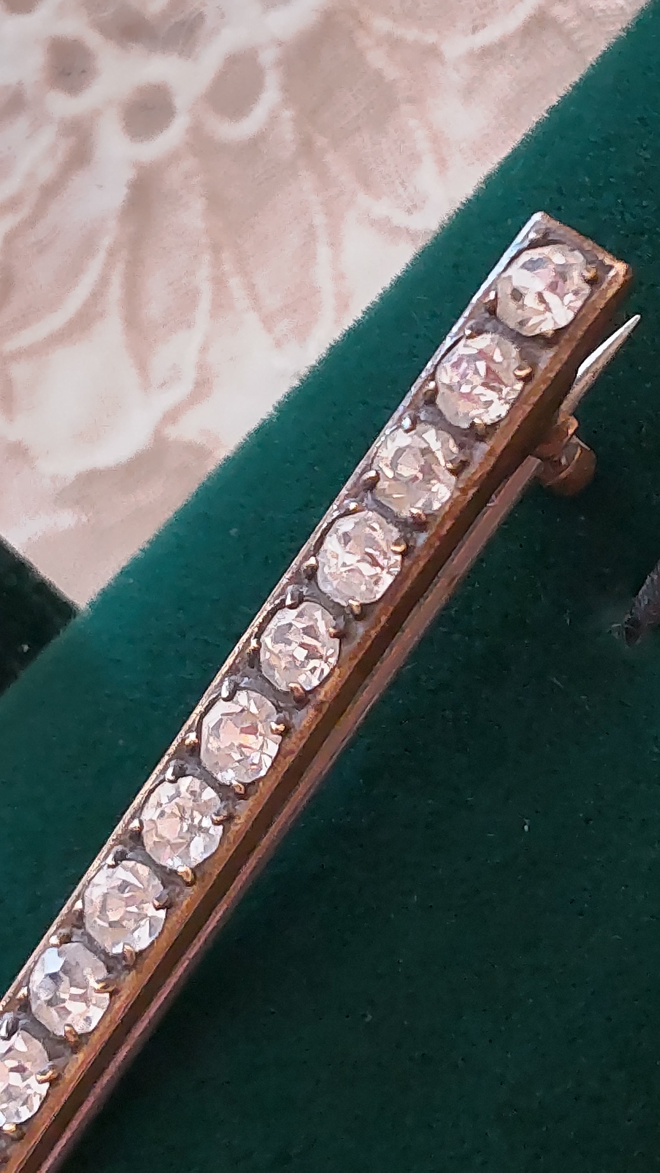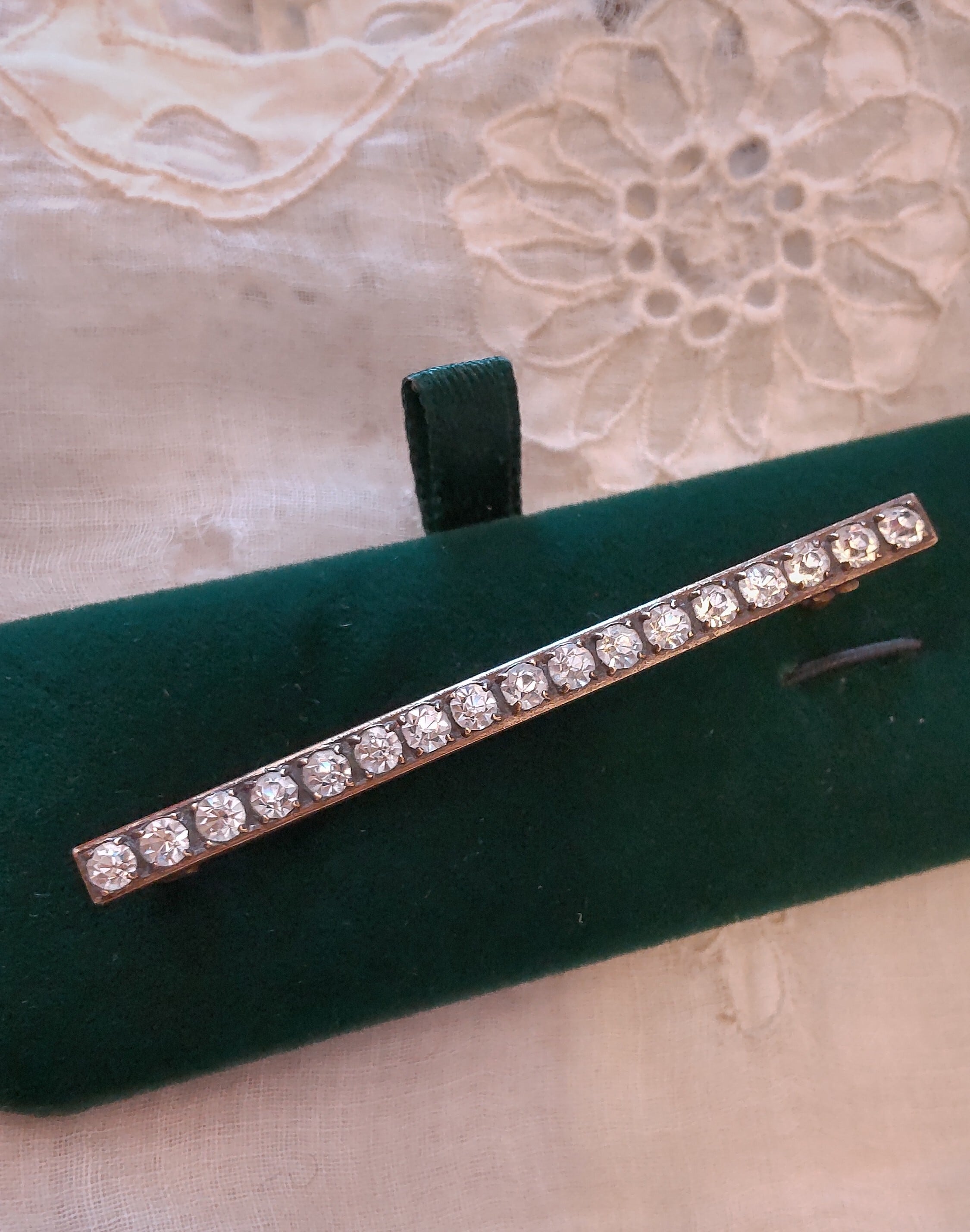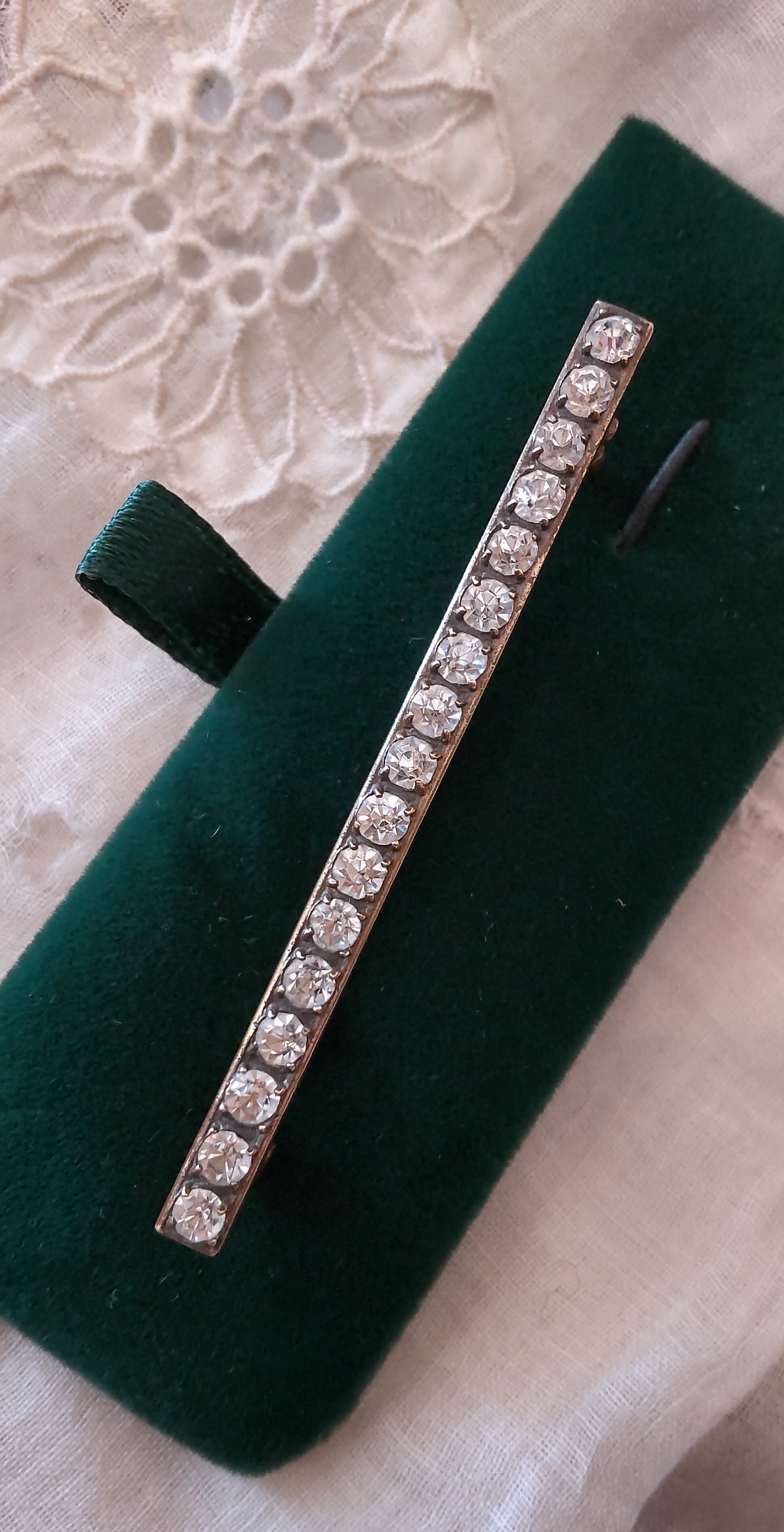 1920年代頃の17粒のガラスのクリスタルがひと粒ずつ爪留されている丁寧な作りのバーブローチです。